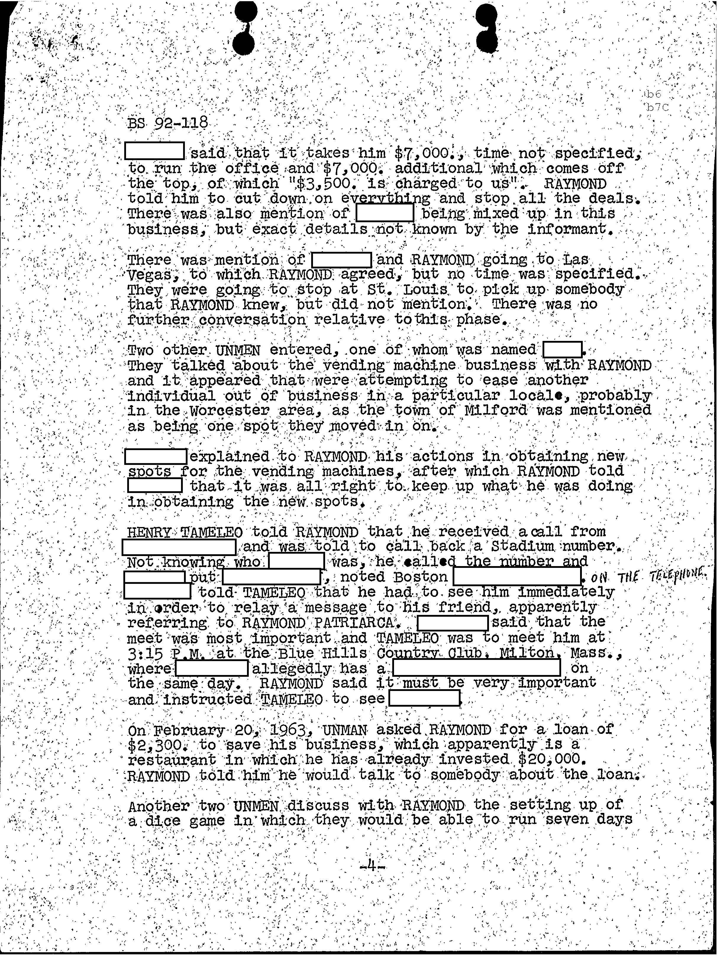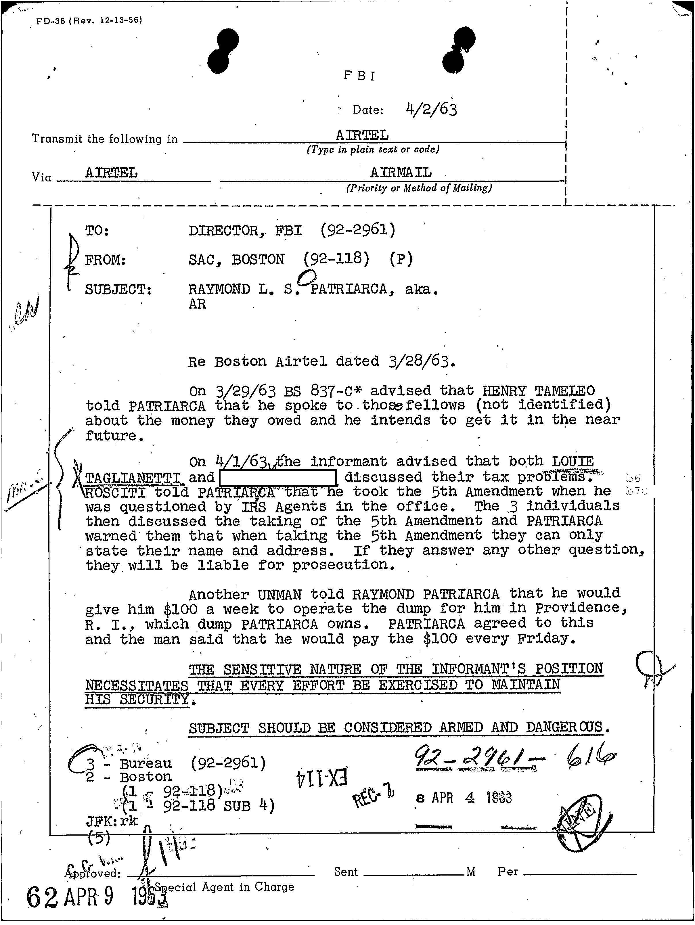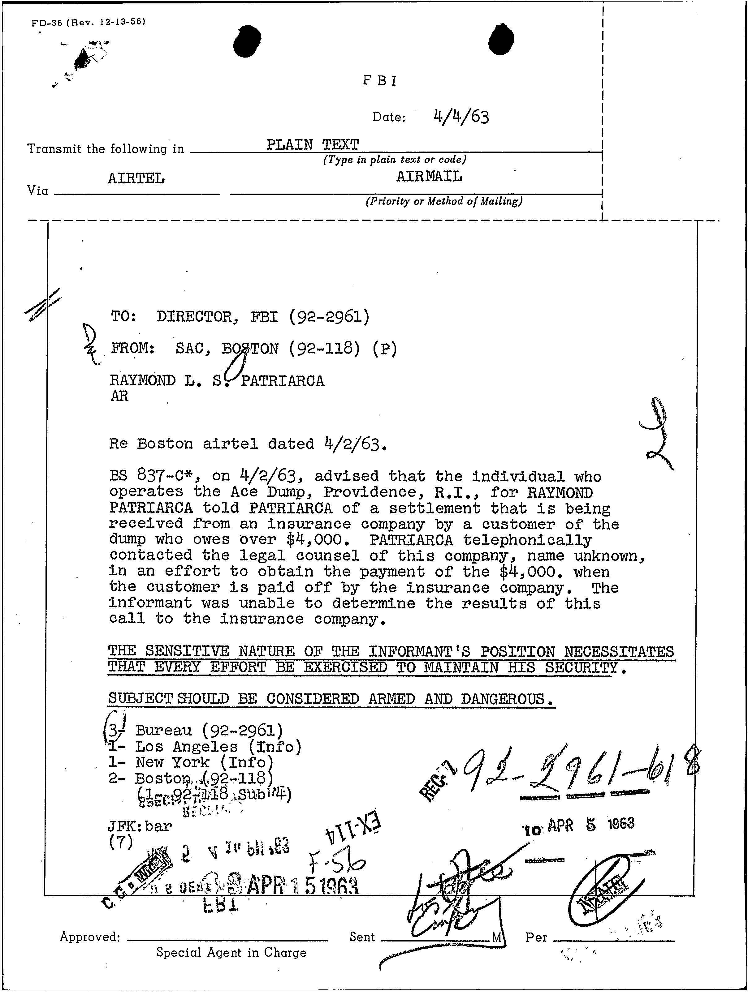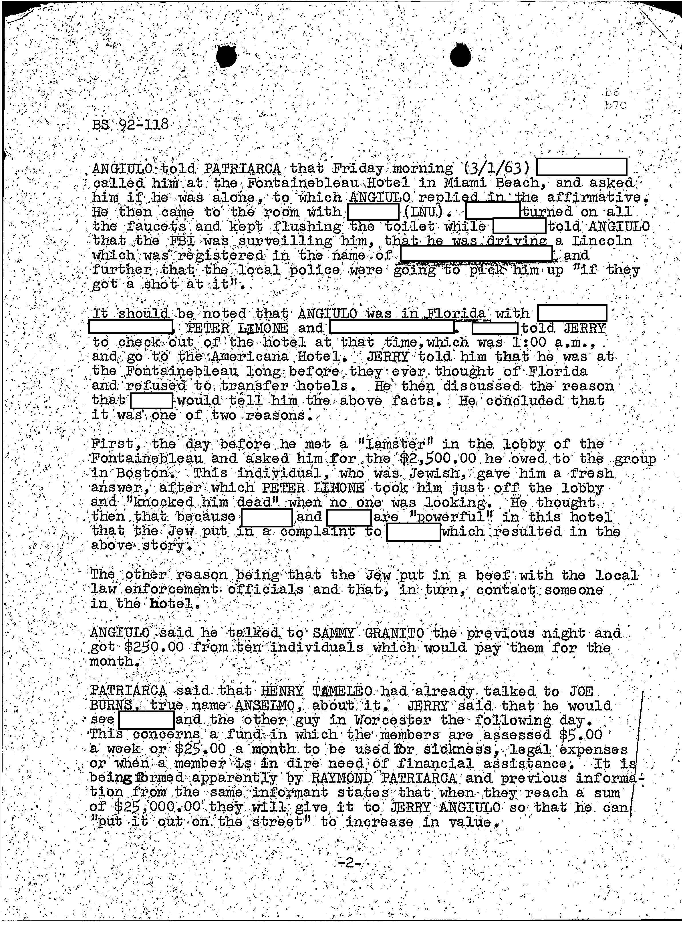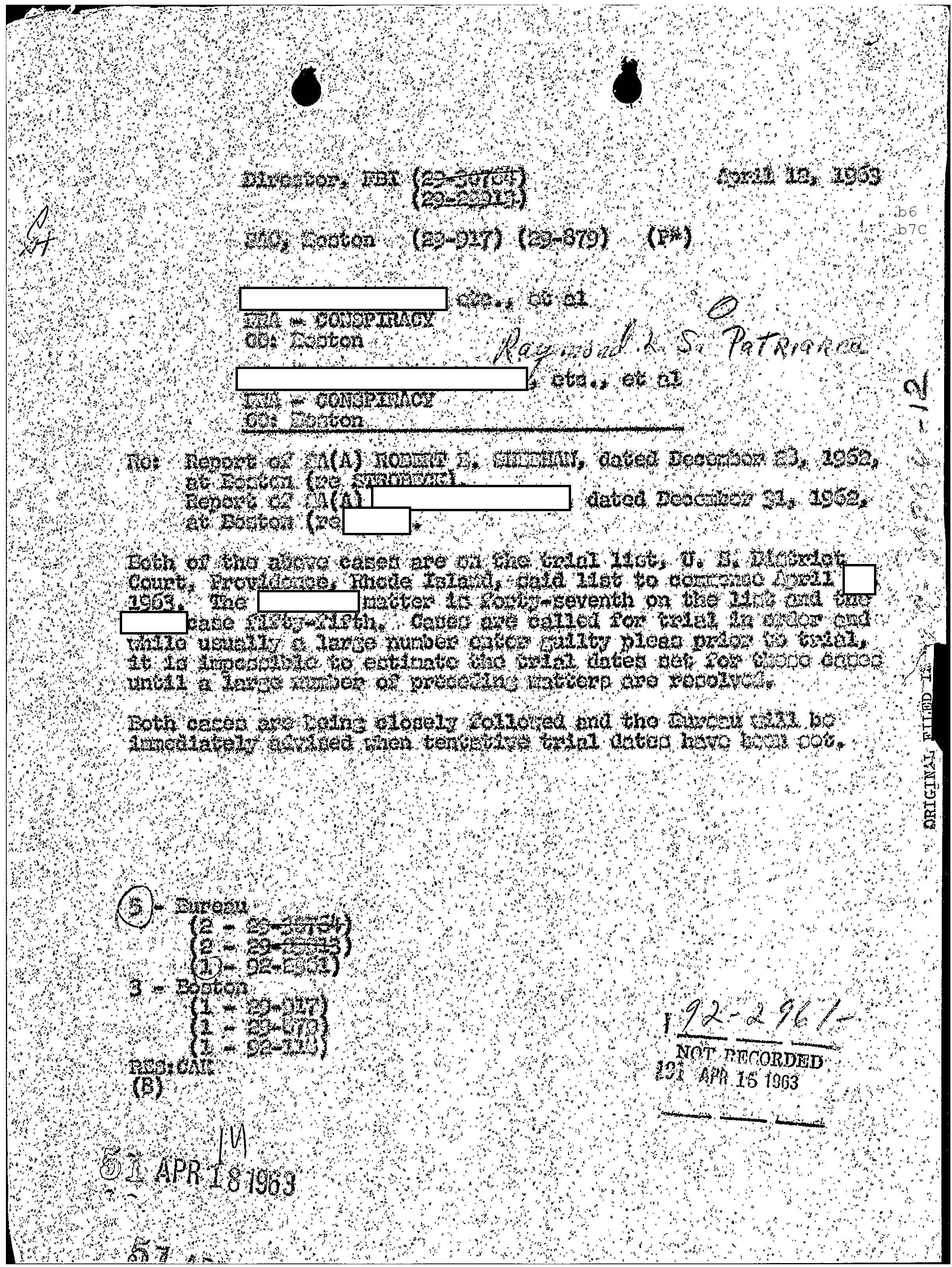 FBI Files - The Patriarca Papers - Entry 29 (Patriarca Claims He Paid Off Senator Pastore)