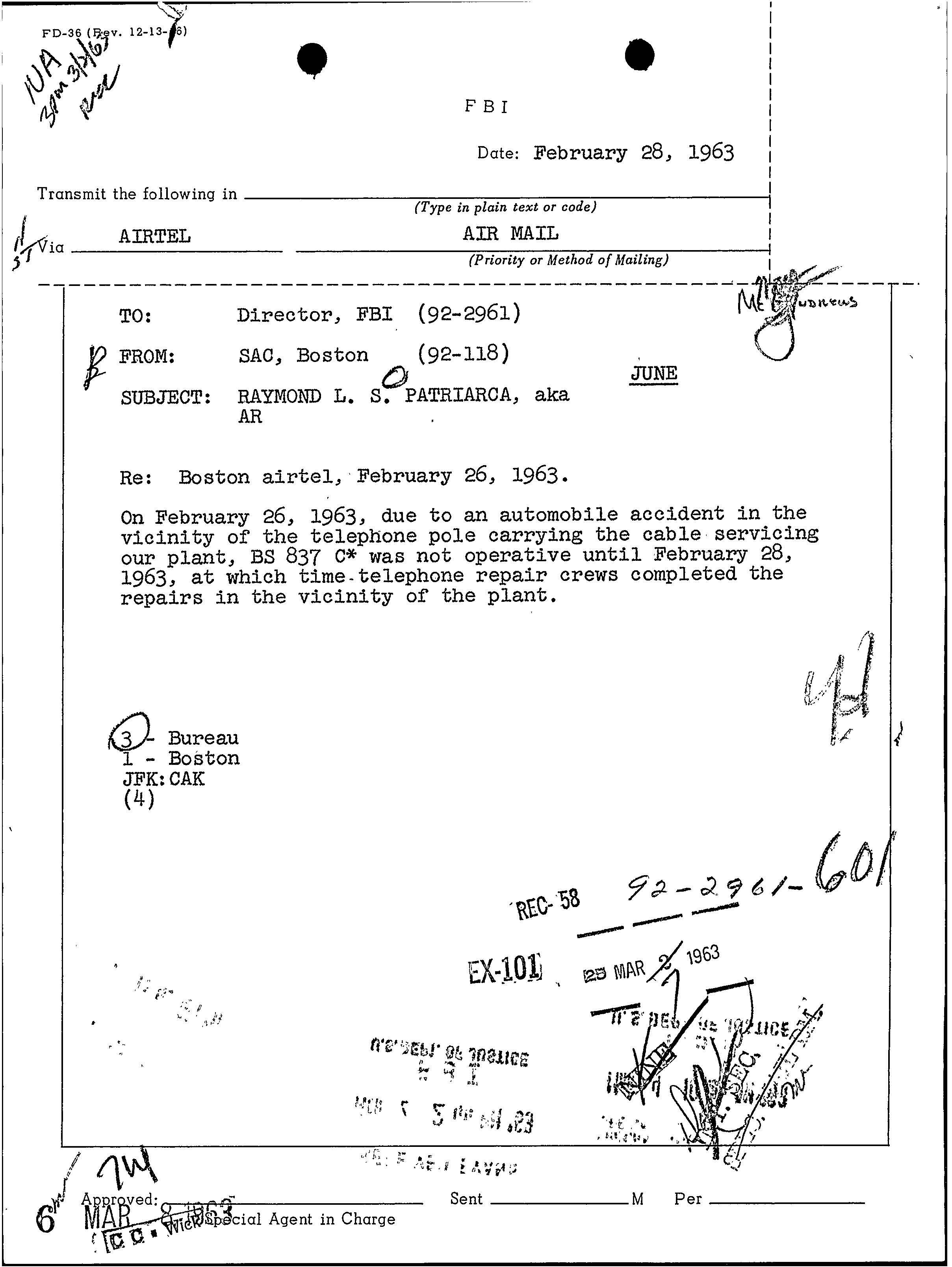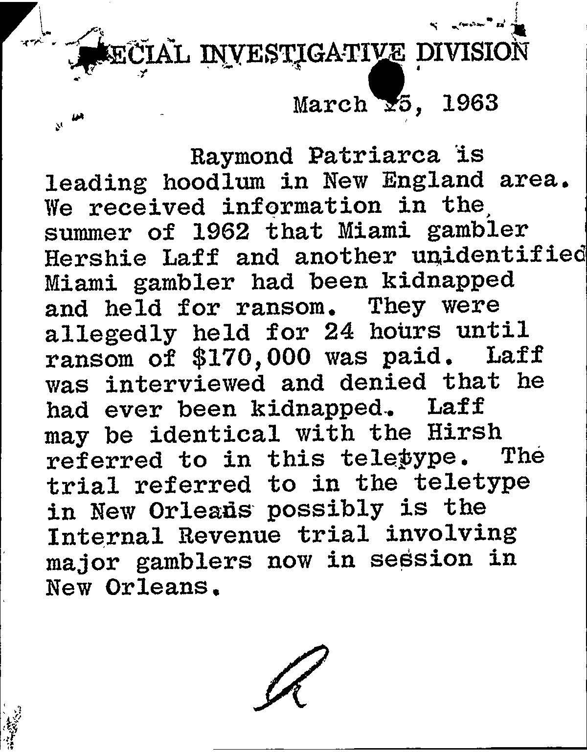 GET THE LATEST BREAKING NEWS HERE -- SIGN UP FOR GOLOCAL FREE DAILY EBLASTThe jail break incident referenced was previously reported by GoLocal. The FBI files (a December 27, 1957 memo) outlined that Patriarca was arrested in September of 1944 by the RI State Police “on charges of accessory before the fact to murder, two counts, in connection with the April 19, 1930 Easter Sunday attempted jail delivery at the Rhode Island State Prison which charges were subsequently dismissed.”