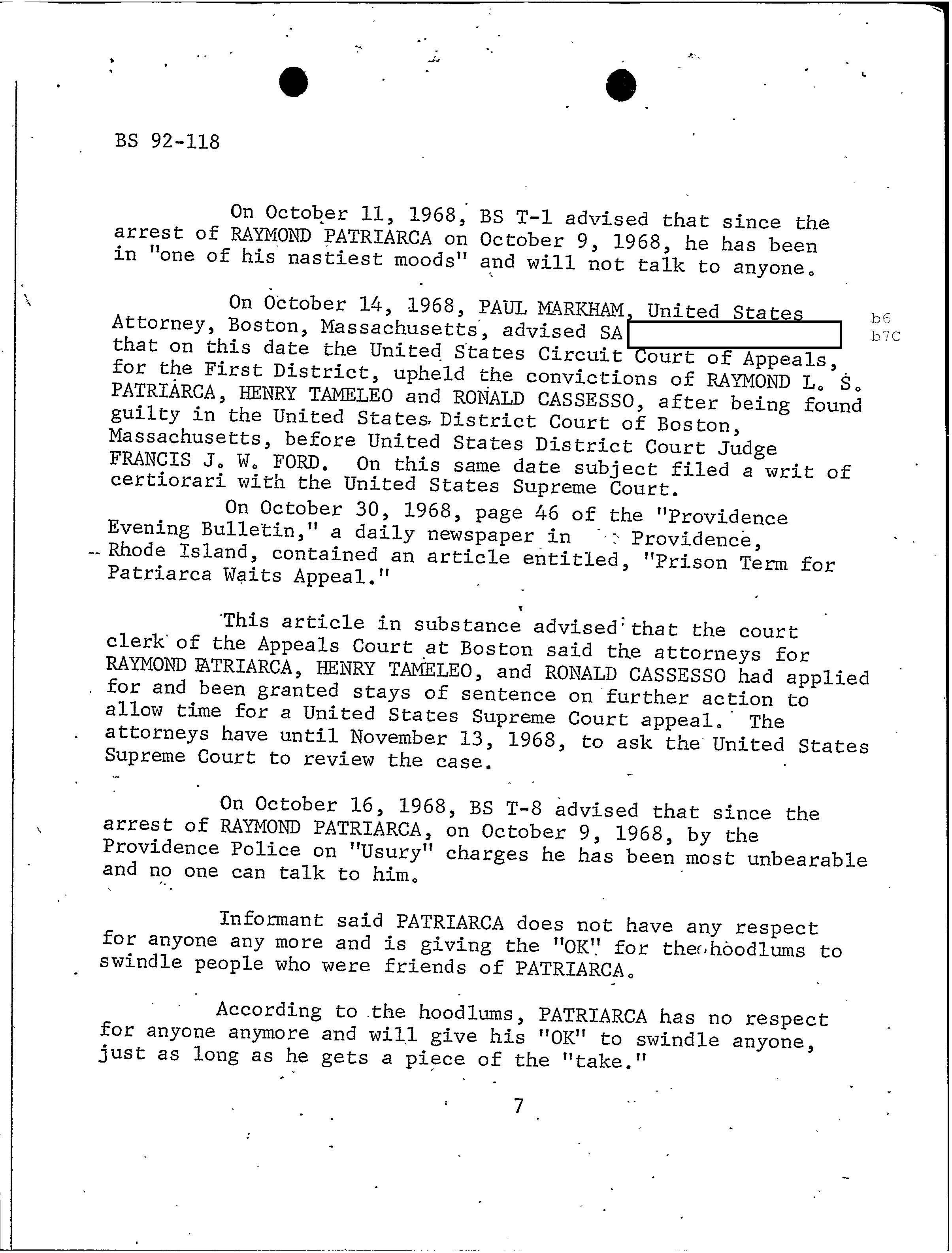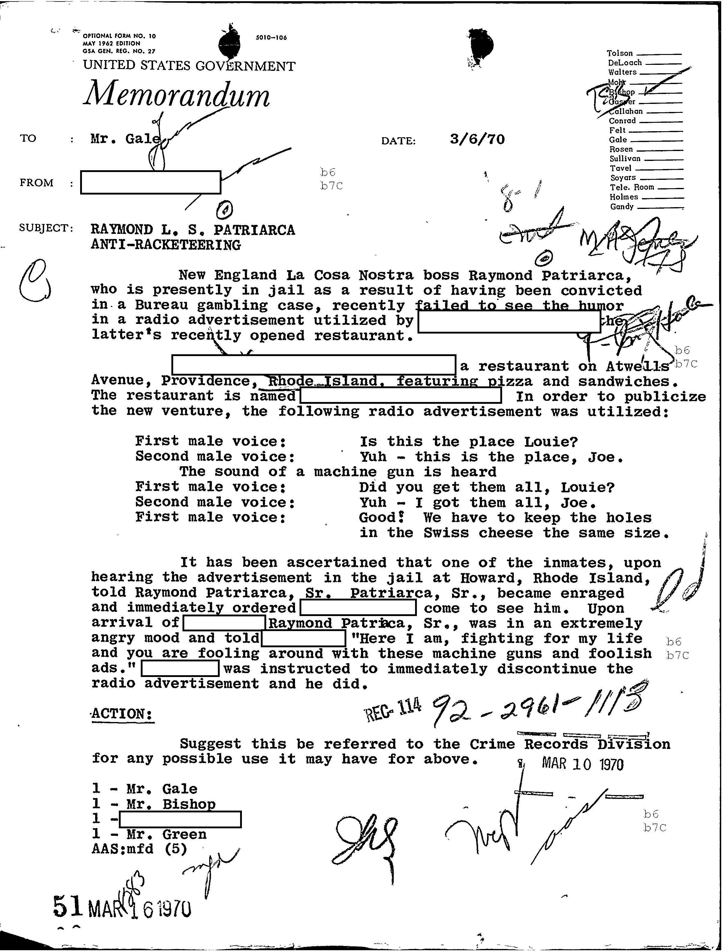 In March of 1970, a FBI memo outlines how Raymond Patriarca was infuriated by a mocking mob ad.