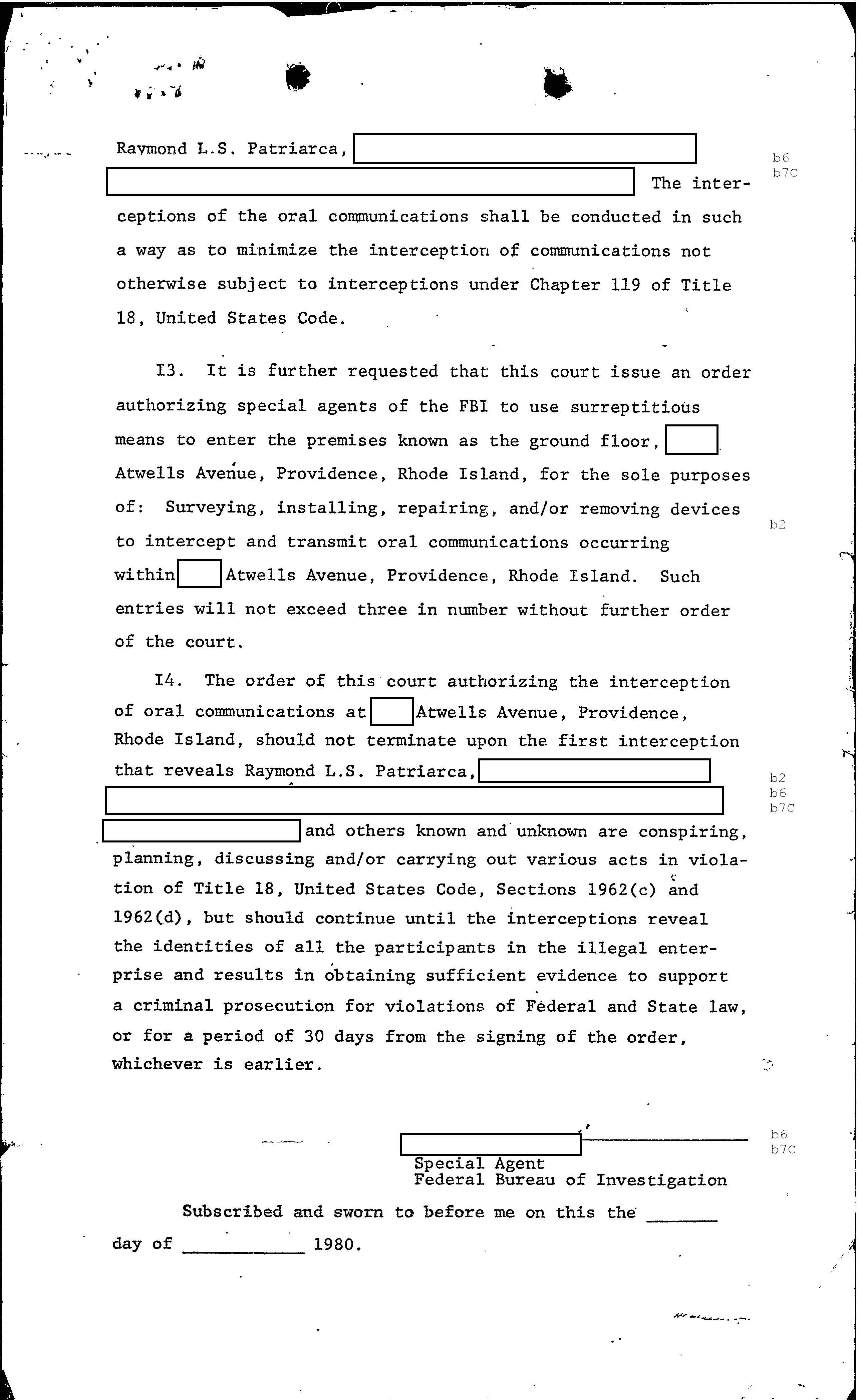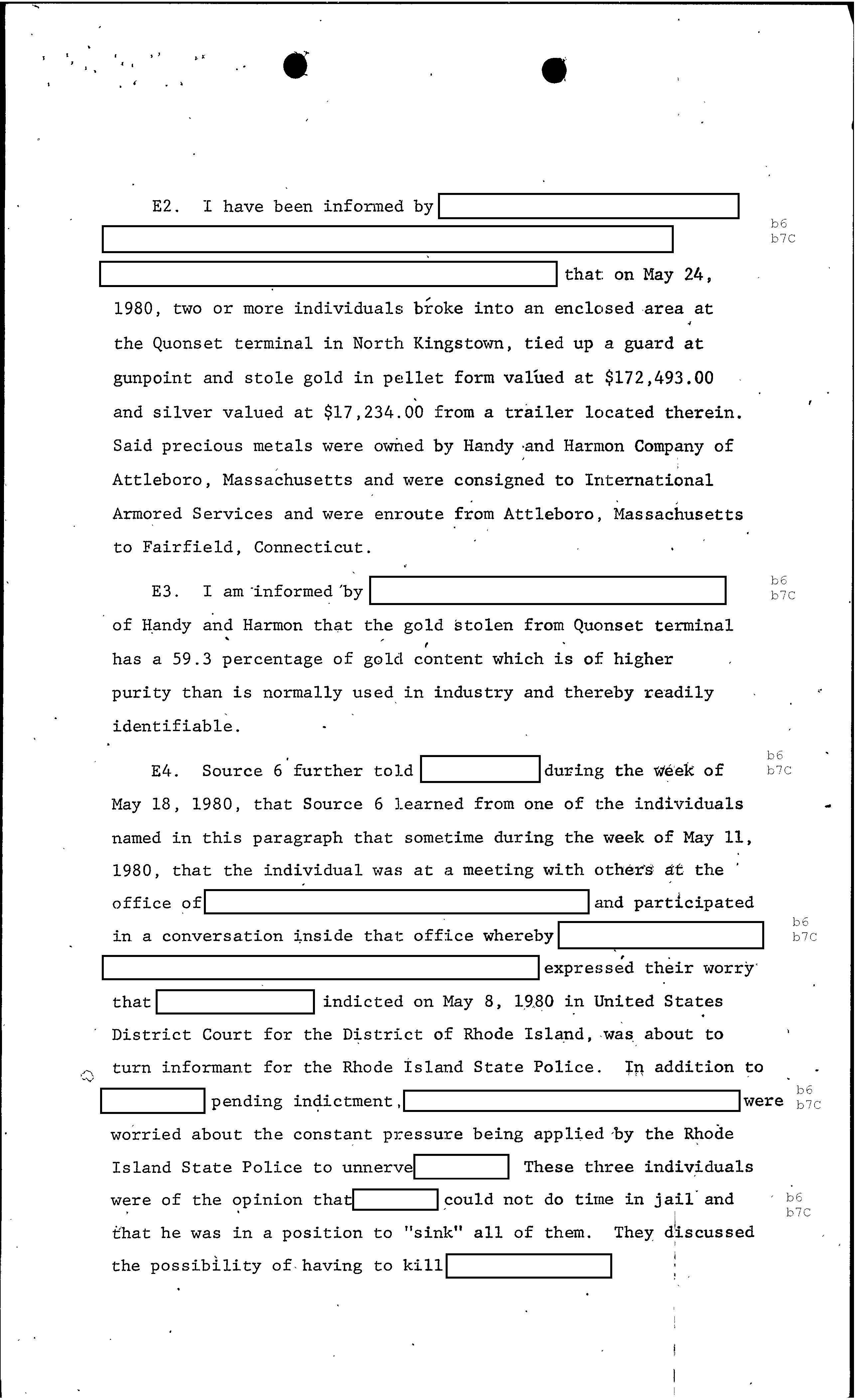 “I have been informed by REDACTED that on May 24, 1980, two or more individuals broke into an enclosed area at the Quonset terminal in North Kingstown, tied up a guard at at gunpoint and stole a pallet form valued at $172,493.00 and silver valued at $17,234.00 from a trailer located therein. Said precious metals were owned at Handy and Harmon Company of Attleboro…”