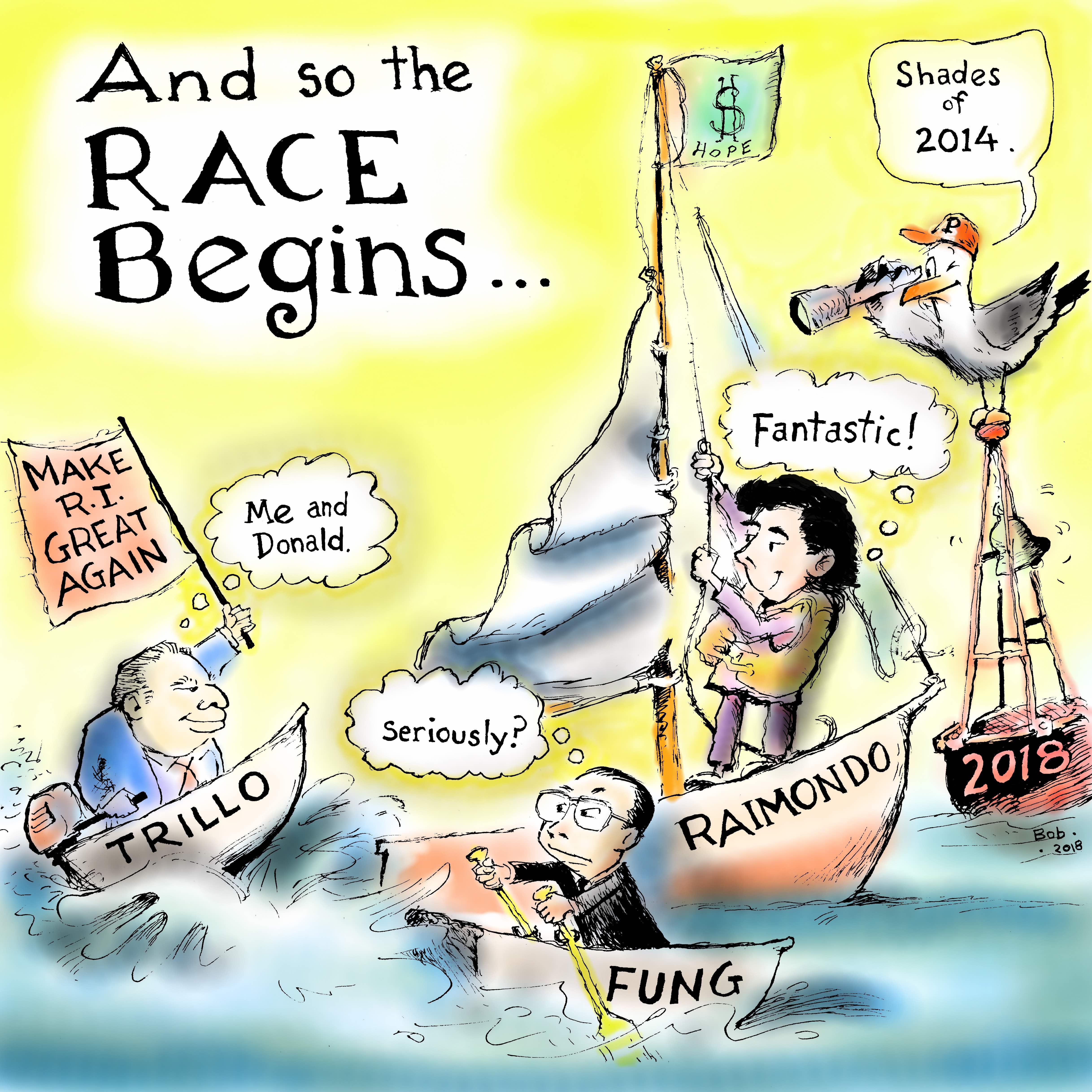 Let the race begin, political cartoon by R.W. AlleyAnd, know Fung faces the same difficult three-way scenario as in 2014 with the addition of Joe Trillo to the mix for the general election.