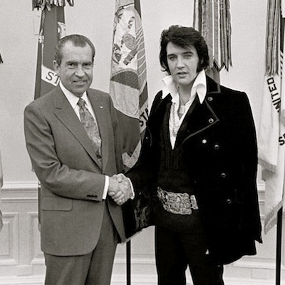 Then there's Legend Elvis Presley, whose name, some claim, is derived from the Greek work "elpis", or "hope" (also the motto for Rhode Island). "Hope" is a confident expectation of good, one in which a man keeps his voice, retains his values, and gets the votes, or the popularity, without striving. While "The King of Rock and Roll" was making millions, going places, doing great things, selling and wowing crowds, he also liked to collect police badges. One evening, he decided to call on President Richard Nixon and ask for a Drug Enforcement Agency badge, which would allow him to help President Nixon prosecute drug offenses. Hopping on a red-eye flight to Washington, Presley penned a letter to the President, sharing his respect and offering to assist the President. Within days, the White House staff arranged a meeting between "the King and the President." Nixon and Presley met soon enough. Photos of this unique meeting showcase Nixon admiring Presley, not the other way around, then a handshake, and Presley got his badge.