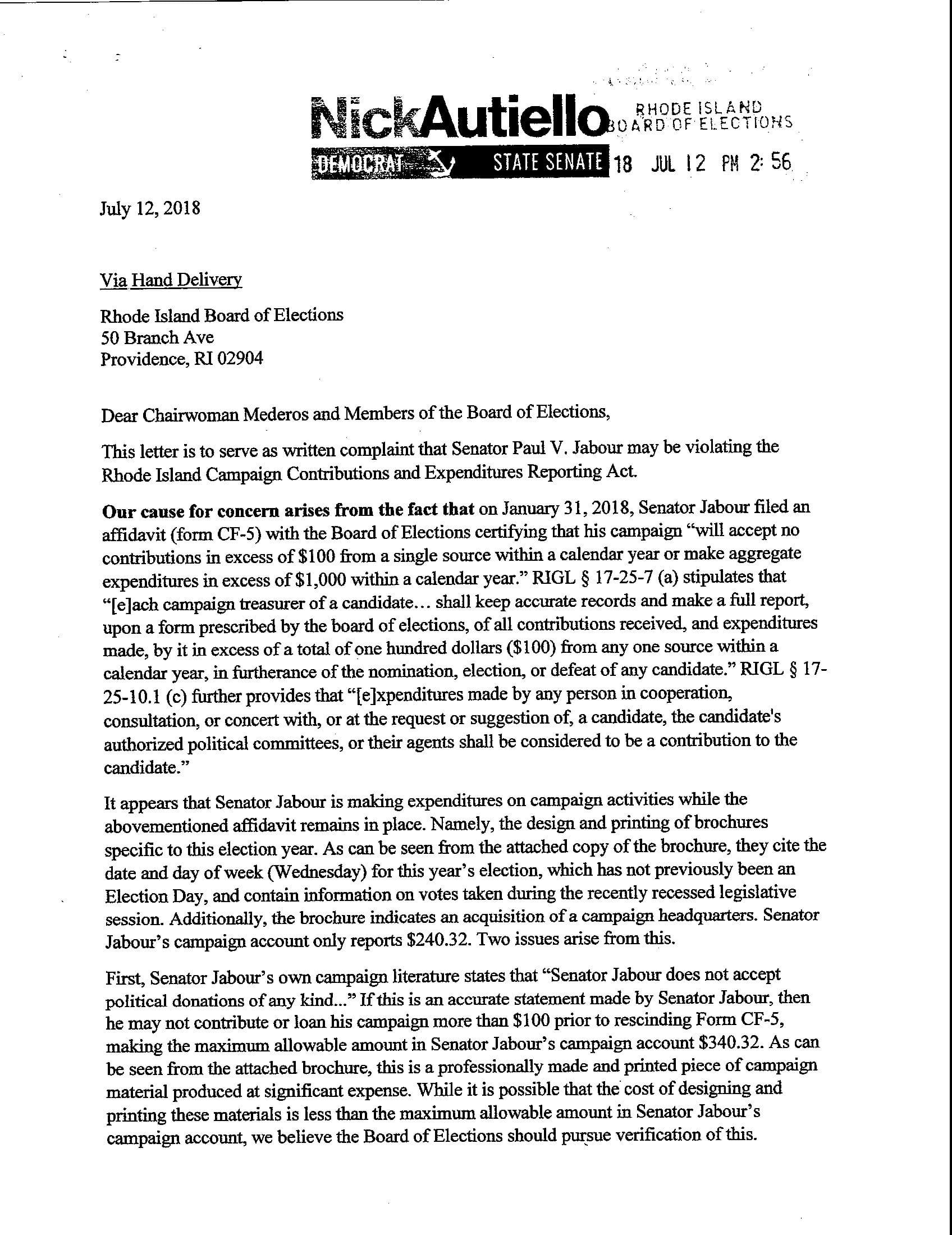 Autiello Files Campaign Finance Complaint Against Senator Jabour