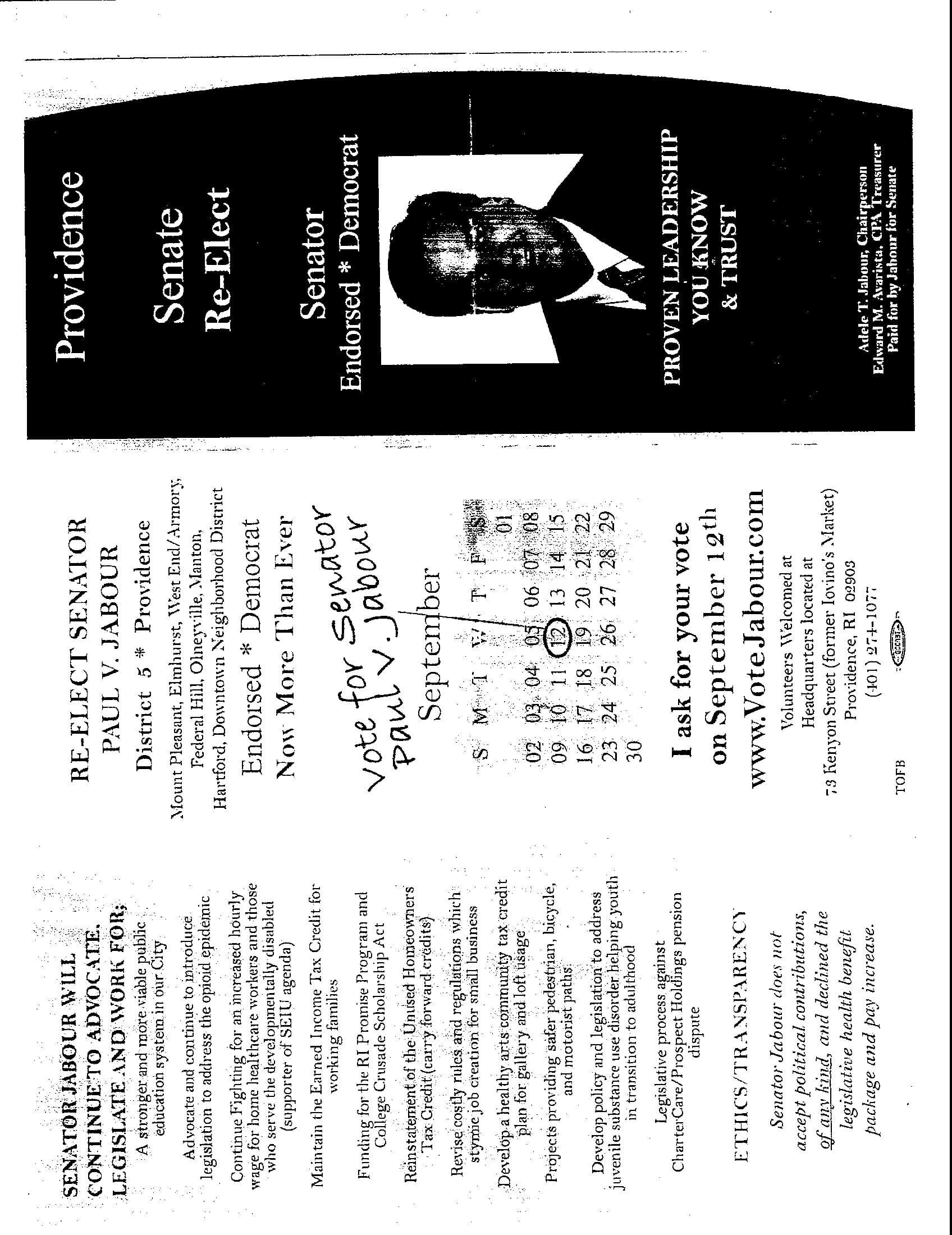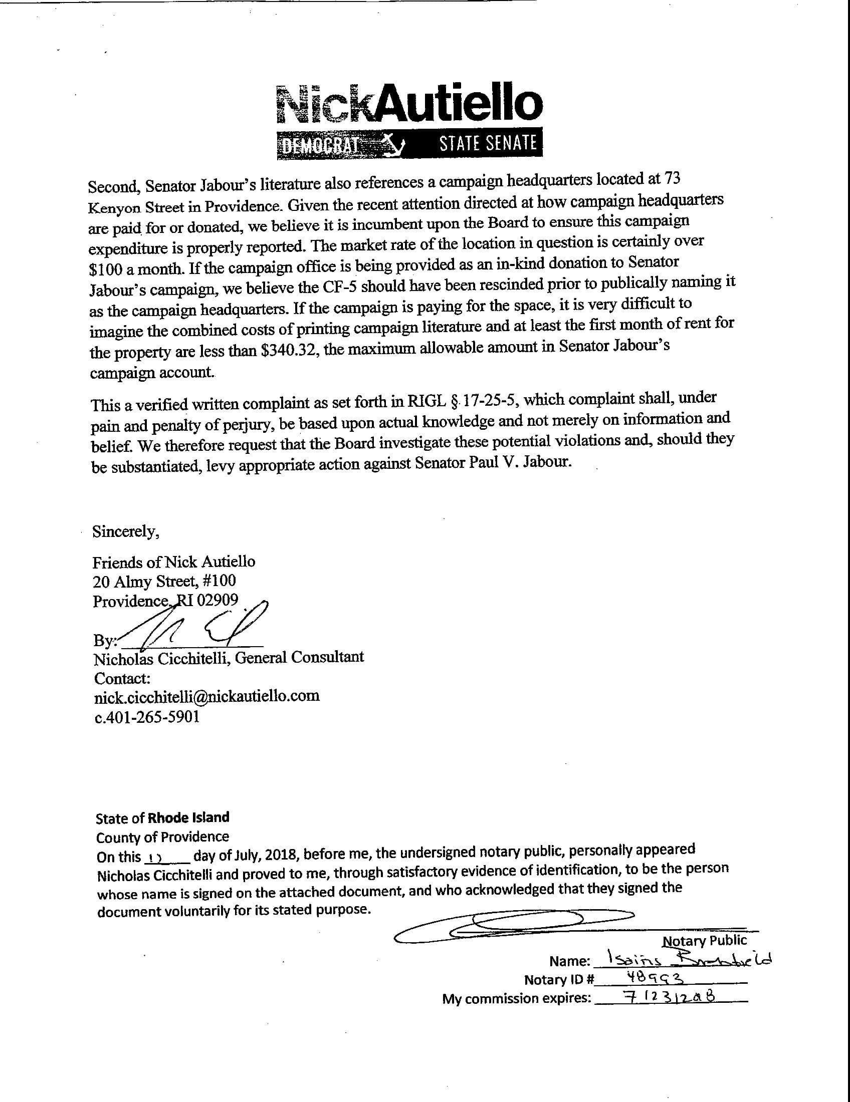 “The evidence points to Senator Jabour playing fast and loose with campaign finance rules. Public trust in our political leaders is especially low right now, so a lack of transparency on something as critical as campaign finance cannot be tolerated. It makes it even harder for everyday Rhode Islanders to trust that their elected officials are looking out for them. Senator Jabour makes a big deal about having so much personal wealth that he doesn't need to fundraise for his campaign, something those of us with student loans and a rising cost of living can't afford to do. So it just doesn't make sense that he's making campaign expenditures clearly above the limit he certified with the Board of Elections when he could have easily chosen to file the correct paperwork and avoid any confusion,” said Autiello.
