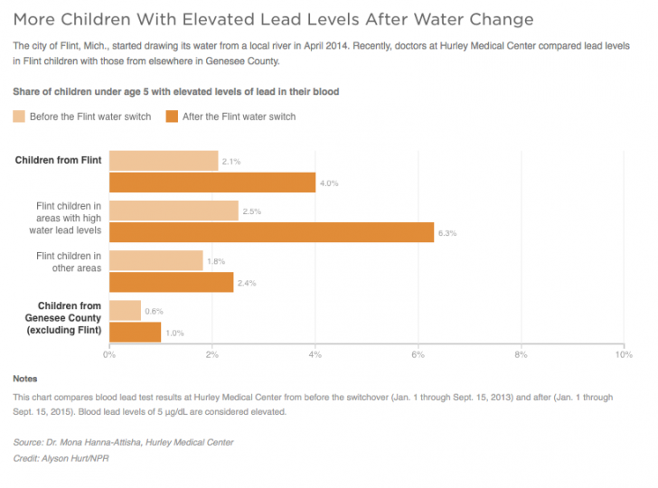 Those worst in Flint neighborhood numbers did show a rise from 2.5% and there is little question that there is a correlation with the change in water supply. Although, children in the region but outside the Flint water service also showed statistically significant increases during the same period. Minor points like the time of year of sampling actually matter as childhood lead levels peak in June and are at their minimum in March, according to the CDC (the reason for this is not established although researchers speculate it is related to more outdoor activity where longstanding deposition of lead on soils and surfaces exposes children).