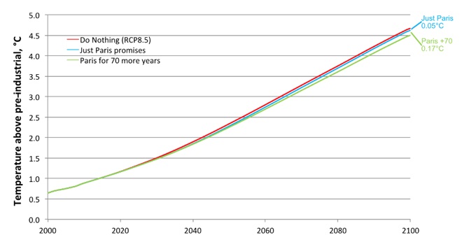 What is actually at stake? Environmentalists show us graphs that say Paris really matters. It could limit temperature increase by a degree Celsius although they would prefer much deeper cuts to limit the increase by 2 degrees. But Bjorn Lomborg in a peer-reviewed paper shows Paris would be an order of magnitude less effective. Lomborg assumed that voluntary commitments were all adhered to and accepted doubtfully high values of CO2 sensitivity modeled by the International Panel on Climate Change. Yet the very climate models use to alarm us show Paris would do next to nothing.
