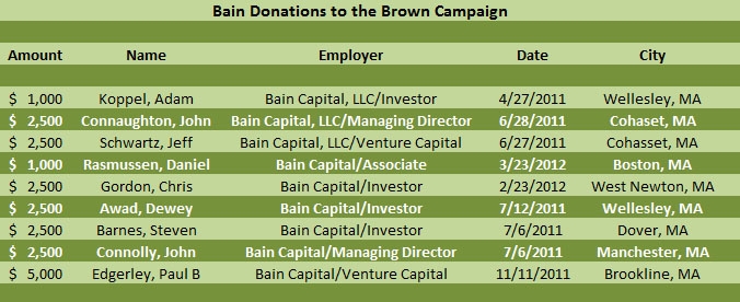 In the current election cycle, incumbent U.S. Senator Scott Brown (R-MA) received $22,000 from nine individual Bain executives. Brown has sided with Romney on various issues, most recently, on the decision to try and repeal the Affordable Care Act.