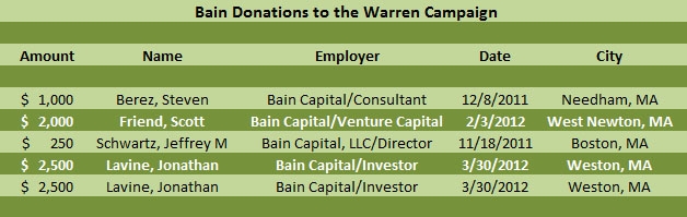 Among Warren's Bain donors is Managing Director & Chief Investment Officer Jonathan Lavine at Sankaty Advisors (a Bain Company), who gave two separate donations of $2,500, the most any individual can give at one time. Under guidelines from the Federal Election Commission, a cap has been established for primary elections and general election donations so that an individual can only contribute $2,500 for each election.