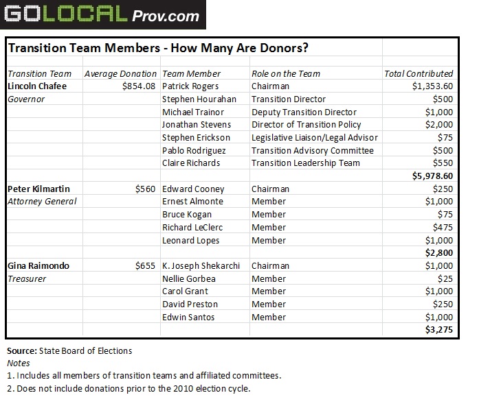Of the 12 people on the transition leadership team and advisory committee for Governor-elect Lincoln Chafee, seven were big-dollar donors, with the average contribution exceeding $800. For incoming Attorney General Peter Kilmartin, five out of 13 were donors who contributed an average of $560. General Treasurer-elect Gina Raimondo has five donors on her nine-member transition team, each of whom gave an average of $655.