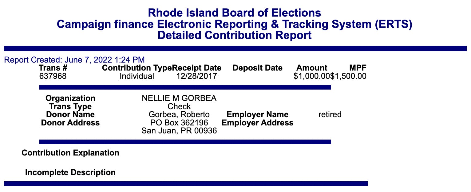 Gorbea's mother's donations began in 2013 and total $7,500. Nellie Diaz uses P.O Box 362196 in San Juan.