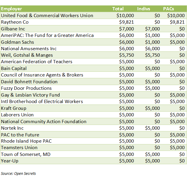 Since 2010, Cicilline has received $84,800 from the Securities & Investment industry, including Goldman Sachs and Bain Capital, which make up two of his largest donors in the 2012 campaign cycle, according to Open Secrets. The only groups that have contributed more to Cicilline have been lawyers or law firms ($269,415), retired folks ($176,460) and real estate companies ($174,450).