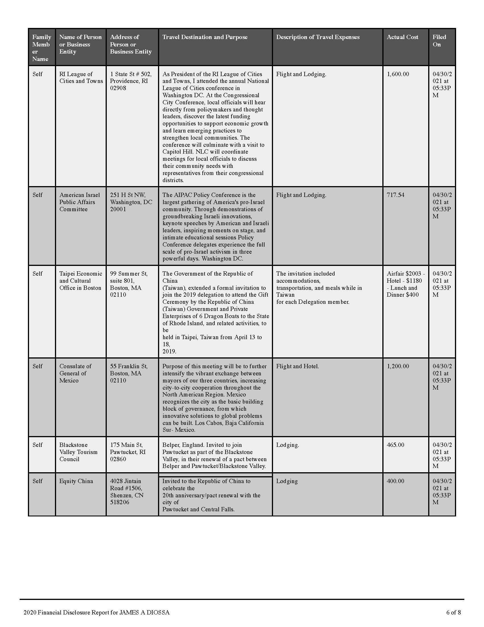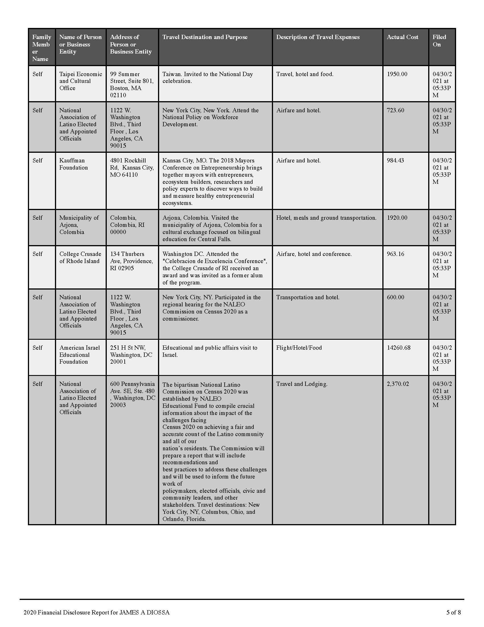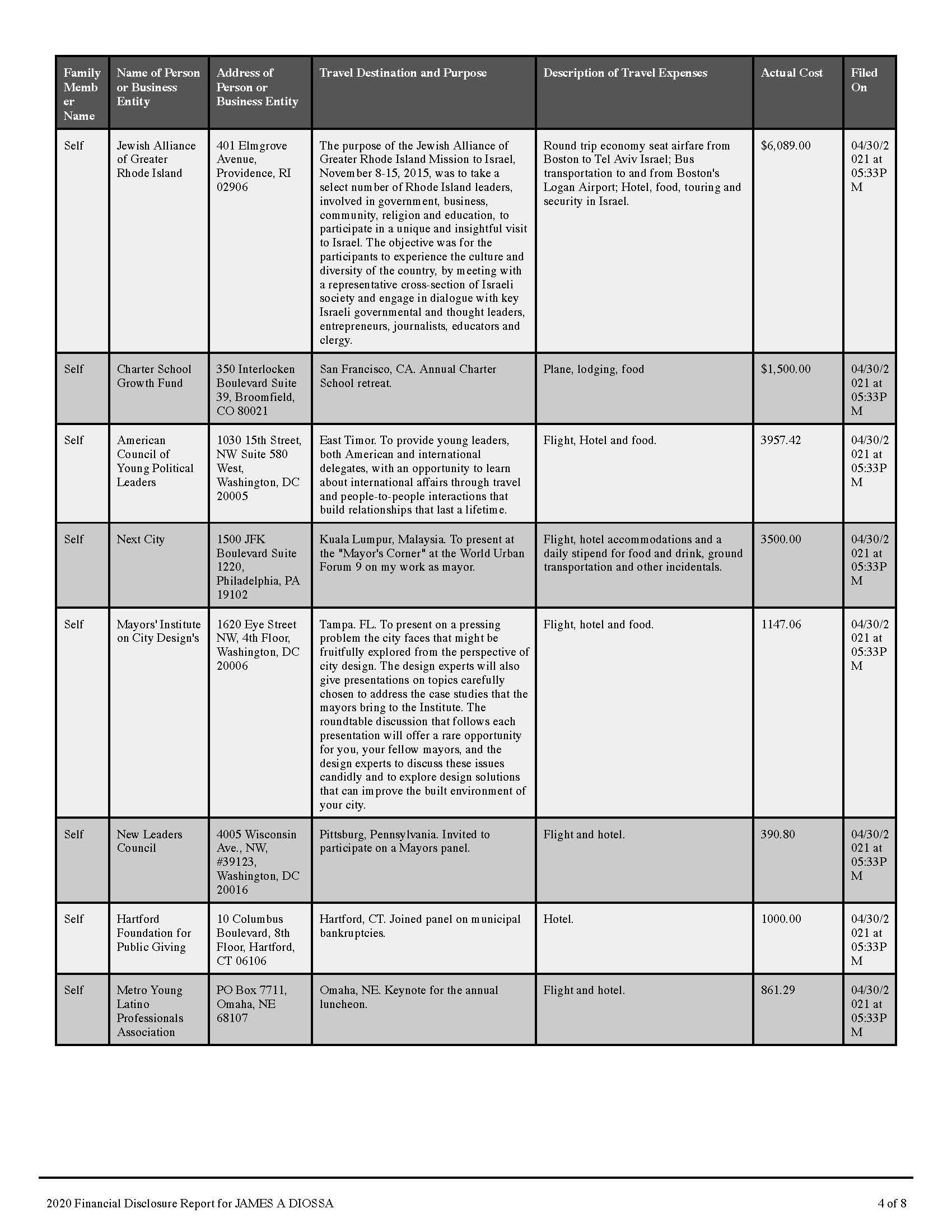 According to James Diossa’s Ethics Commission Financial Disclosure Statement, he, as Mayor of Central Falls, traveled across the world funded in part paid by third parties.