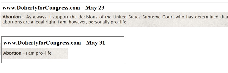 One week ago, his campaign Web site said that Doherty “support[ed] the decisions of the United States Supreme Court,” including its rulings that abortion is legal, even though he “personally” was pro-life. But now that statement has been scrapped in favor of simpler language: “I am pro-life.” (See screen grabs from campaign site.)