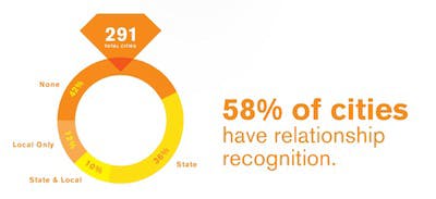 Because this is an evaluation of municipalities, not states, and marriage is a state-level policy, this section is weighted so that an equal number of points are awarded for marriage (or other state relationship recognition) and municipal domestic partner registries.