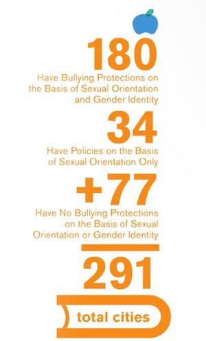 A lack of a direct liason to the LGBT community in the mayor's office hurt Providence in the municipal services category. Providence does, however, have a Human Relations Office tasked with "enforc[ing] laws of equal opportunity in the City of Providence" as well as formally enumerated anti-bullying policies in schools at the municipal level.