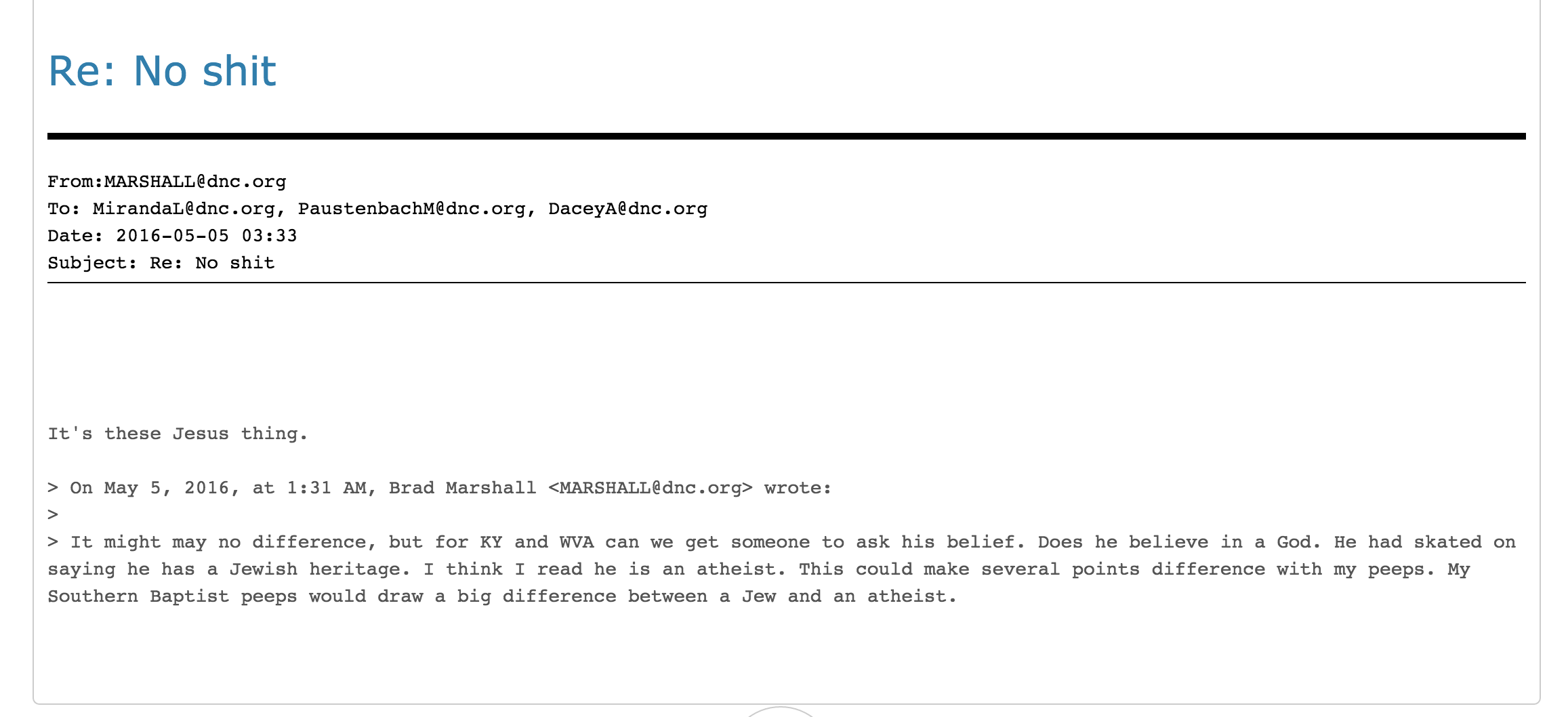 ‘This could make several points difference with my peeps. My Southern Baptist peeps would draw a big difference between a Jew and an atheist,’ DNC chief financial officer Brad Marshall wrote.