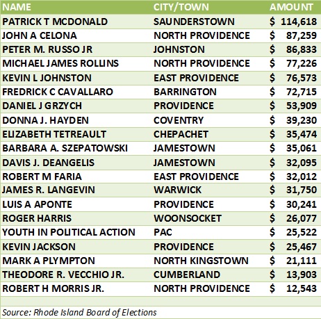 Currently, the five Rhode Islanders who owe the most to the state are former State Senate candidate Patrick T. McDonald ($114,618), former State Senator John Celona ($87,259), Peter M. Russo ($86,833), Michael James Rollins ($77,226) and Kevin L. Johnston ($76,573). Celona served over two years in federal prison for his role in the 2005 Operation Dollar Bill corruption investigation.