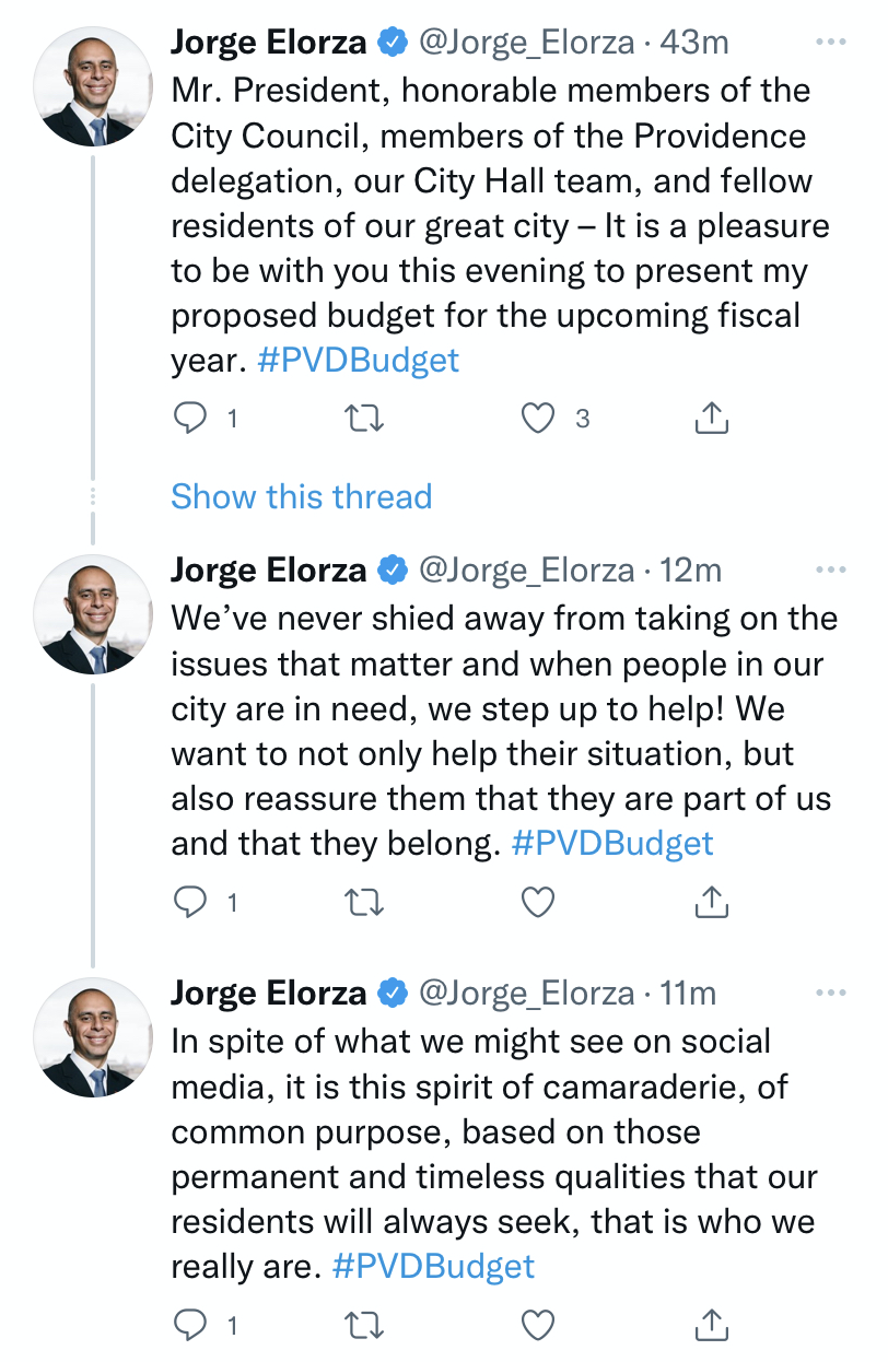 “In spite of what we might see on social media…it is [a] spirit of camaraderie, of common purpose, based on these permanent and timeless qualities that our residents will always seek, that is who we really are,” Tweeted Elorza, adding "#PVDBudget."