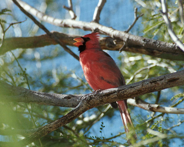 That poor little guy in the picture---that brilliant showy red-plumed male cardinal---is singing his heart out to his flirtatious claret-hued lover.