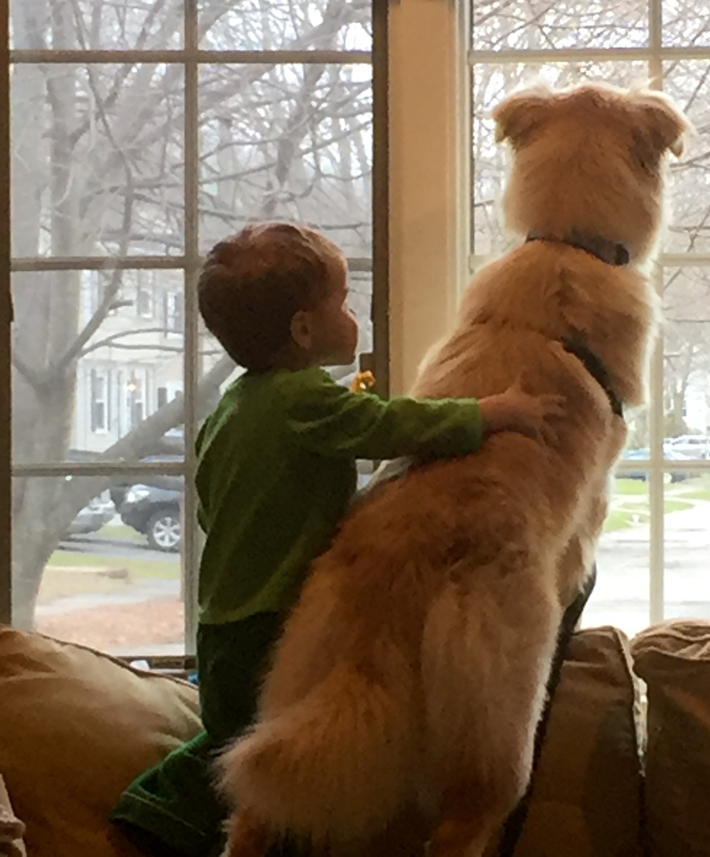 Dixie is a golden retriever, strong, alert, and ever so patient with her new “brothers and sisters”—i.e.—my grandchildren. They of course love her and are hilariously entertained by her. The two year old, being a typical two year old, hangs on her neck, scratches her ears, and generally mugs her with whatever is at hand. Dixie just wags her tail, serenely happy to be in a home where she is loved.