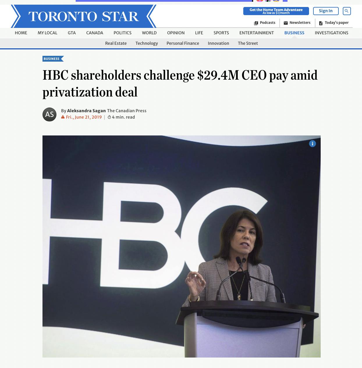 At her first corporate annual meeting, about one-quarter of votes cast by HBC shareholders opposed the company’s multi-million dollar payouts to top executives for the second year in a row at an unusually secretive annual general meeting, reported the Toronto Star.