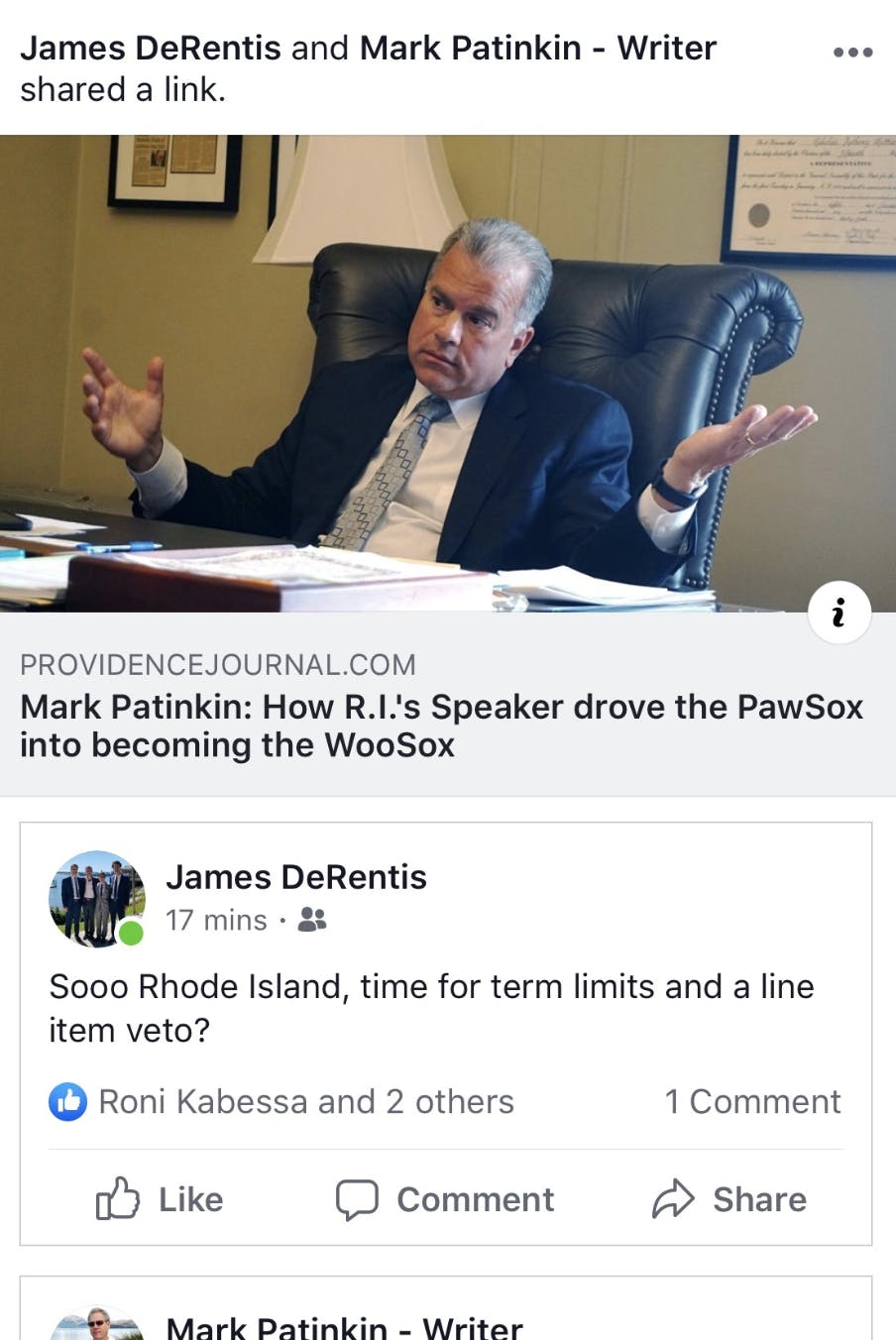 Jim DeRentis, a prominent realtor on the East Side of Providence who is the husband of top Raimondo staffer Brett Smiley, shared a newspaper article on Facebook that was highly critical of Mattiello’s handling of the Pawtucket Red Sox.