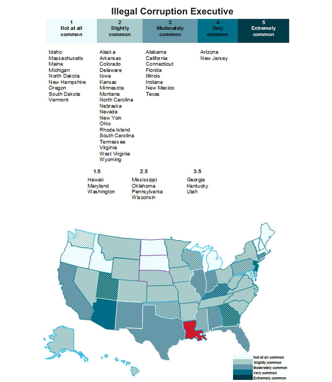 Rankings are broken down into two categories for each branch of government: "legal corruption" and "illegal corruption." Illegal corruption is defined by the study as "the private gains in the form of cash or gifts by a government official, in exchange for providing specific benefits to private individuals or groups." The study defines legal corruption as "political gains in the form of campaign contributions or endorsements by a government official, in exchange for providing specific benefits to private individuals or groups, be it by explicit or implicit understanding."