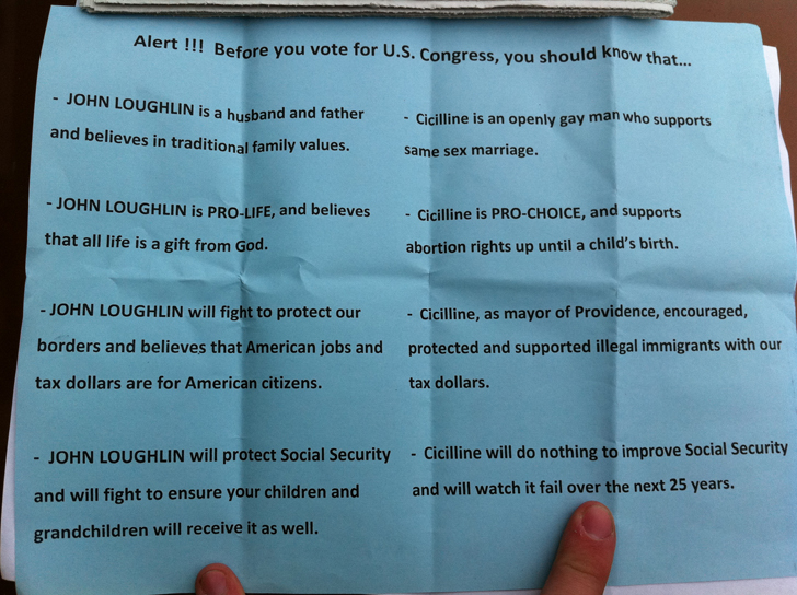 The flyer in part reads: “Alert!!! Before you vote for U.S. Congress, you should know that… John Loughlin is a husband and father and believes in traditional family values. …Cicilline is an openly gay man who supports same sex marriage." The flyer also calls attention to Cicilline's positions on abortion and illegal immigration. (See below for an image of the flyer.)