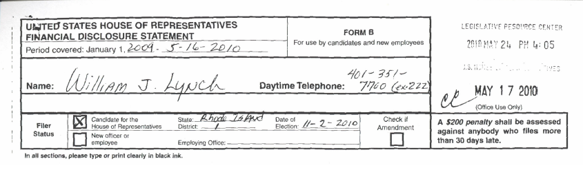 But when it comes to income, Lynch makes far more than Cicilline. Lynch, who is a partner in McIntyre, Tate, and Lynch, earned $863,868 in 2009, according to his financial disclosure statement filed with the Legislative Resource Center for the U.S. House of Representatives. In the first four months of 2010, Lynch has already earned $237,052, according to the May 17 document. (See copy below.)