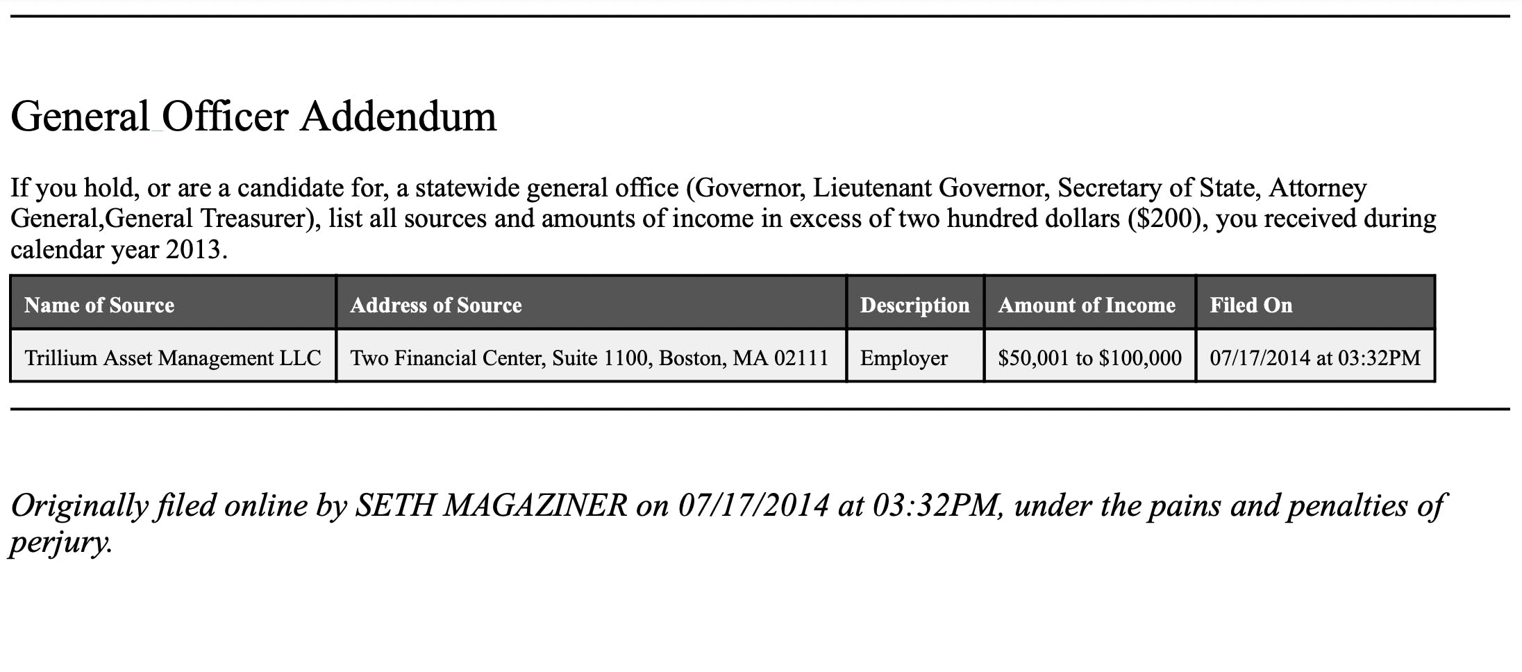 Directly after graduating from Brown University, Magaziner became an elementary school teacher for two years and later joined Trillium Asset Management. He worked at Trillium for two years and three months and according to disclosure forms filed by Magaziner with the Rhode Island Ethics Commission, he’d earned less than $100,000 at Trillium.