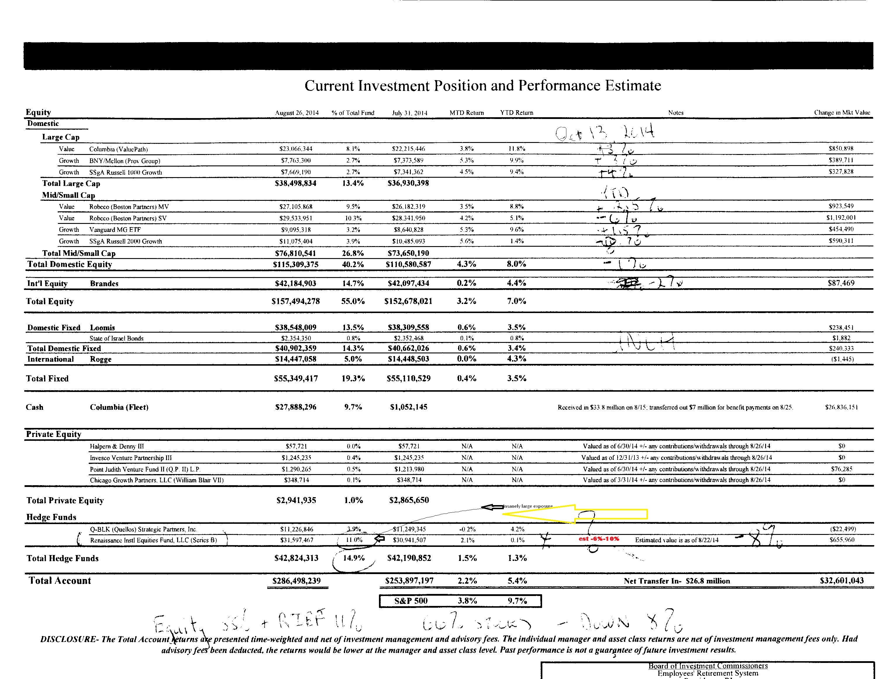 This drop of between 6% and 10 % in 6 weeks is very dangerous for the pension fund (roughly $280 million) and a lesson in why many consider the current risk in Taveras pension Portfolio as ridiculously high. Especially when compared to the funded ratio of the pension plan which I estimate at between 11% and 17%. The real funds in the plan likely lost between $13 and $25 million dollars over the last 6 weeks at the same time liabilities marched relentlessly forward. Providence has not hedged as opposed to the admittedly expensive Hedge Fund Investments by Raimondo designed to hedge against bad markets. Hedge fund strategies differ widely and Providence loaded up on a risky hedge fund and has been badly lagging the market for a year now and is down for 2014. The State has absolute return and stable value or “market neutral” hedge fund exposure so the portfolio is much less risky than Taveras portfolio.