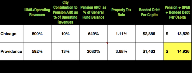 This recent downgrade by Moody’s is a huge warning shot over the bow of cities across America and will directly affect Rhode Island. After several years of warning every city official and actuary that Moody’s clearly was going to focus more on pension accounting, pension debt and OPEB, it is now official. Providence ignored this, and now is very vulnerable to downgrade. Moody’s is using much more reasonable and lower discount rates (well less than 6% in Chicago) on pension liability to determine overall solvency and debt burdens. Cities in Rhode Island would be wise to look at my numbers, which use Moody’s and other leading institutions and economists’ calculations, and ignore the cities own ad hoc discount rates determined by ” hired guns.”