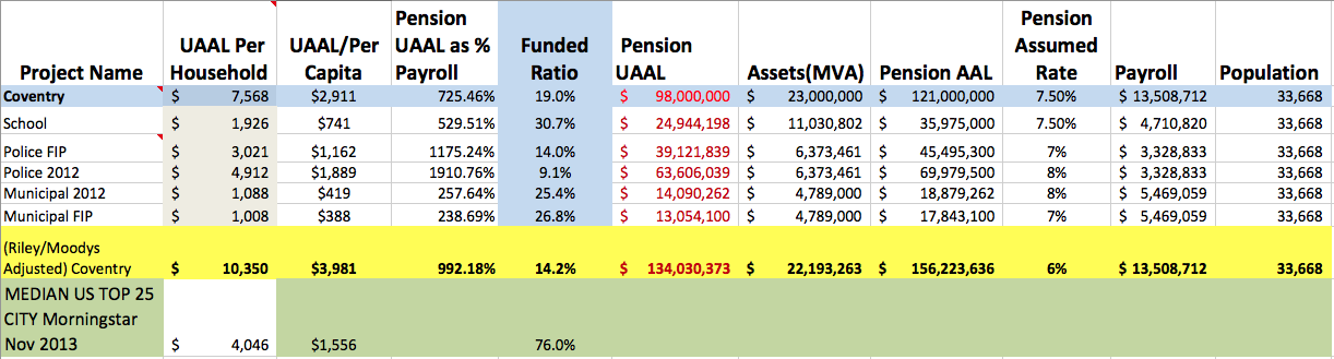 While this is all very interesting, it doesn’t change the math and Coventry will be unlikely to make it to year-end 2014 without a receiver. The town awaits a huge arbitration ruling on a police contract that may render this whole discussion mute and trigger bankruptcy. We should know by the end of this month. In addition, the town understates its liabilities by about $64 million. We show Coventry’s Unfunded Pension Liability as $134,000,000 using Moody’s and GASB 2014 metrics. We also have not included the effects of the liability of CCFD liquidation, which is in the tens of millions.