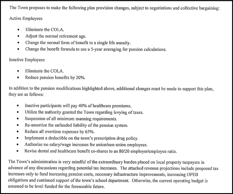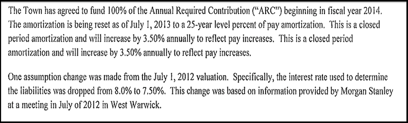 Now that taxpayers and unions are going to court over an already passed law it is important to be aware that Mr. Chafee is not done destroying this state. In late 2011 Mr. Chafee became extremely concerned about the financial condition of cities and towns especially the Pension issues. He declared that 2012 would be the “Year of Cities and Towns”. The key tool for addressing municipal pension debt and OPEB liabilities became the Rhode Island Pension Study Commission headed by his direct report Revenue Director Rosemary Beth Gallogly. The commission’s effort matches the dithering, wandering personality of the Governor. After more than two years this commission cannot even tell us how well each City and Town has done relative to the Funding Improvement plans issued over a year ago. The revenue director, has outside the commission, produced news puff pieces claiming two towns specifically, West Warwick and Narragansett have complied with the Funding Improvement Plans (FIP) they submitted a year ago. Yet there is no evidence of this and at the last Pension Study Commission meeting none was presented. I have directly asked the Town of Narragansett for evidence and they will not even return an email. West Warwick FIP filing highlights from 15 months ago appear below: