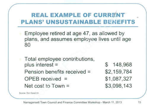 Each town has to look at revenues and whether benefits are too high. Here is a sample of just one employee in Narragansett. Look at his/her contribution versus the compensations. Tell me why we can’t adjust this.