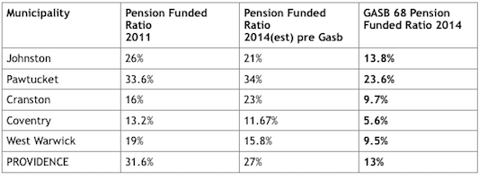 A Municipal Crisis Pension Commission was formed that basically rehashed what Ernie Almonte had reported to the General Assembly and every City and Town since 2007. After 3 years there were no new rules, no consensus on appropriate accounting. Mayors on the “critical status” list didn’t even attend. Chafee appointed Rosemary Booth Gallogly the States Revenue Director who behaved like a teacher handling the after school detention class. Apparently her goal was to waste 3 years and accomplish nothing. Here is the before and after picture of cities and towns with and without required GASB 68 changes now in effect 3 years after Chafee attacked the Crisis and declared 2011 “the year of Cities and Towns” .