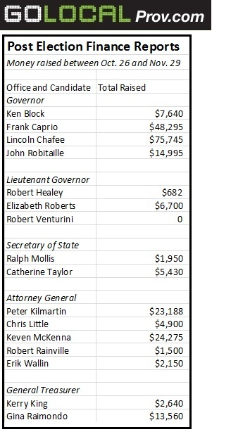 GET THE LATEST BREAKING NEWS HERE -- SIGN UP FOR GOLOCAL FREE DAILY EBLASTChafee has raised a total of $75,745 since Oct. 26 while Caprio has pulled in $48,295 during the same period. Mike Trainor, a spokesman for Chafee, said there had been an “uptick” in fundraising as people saw the campaign was headed in the right direction. A spokesman for Caprio declined comment.
