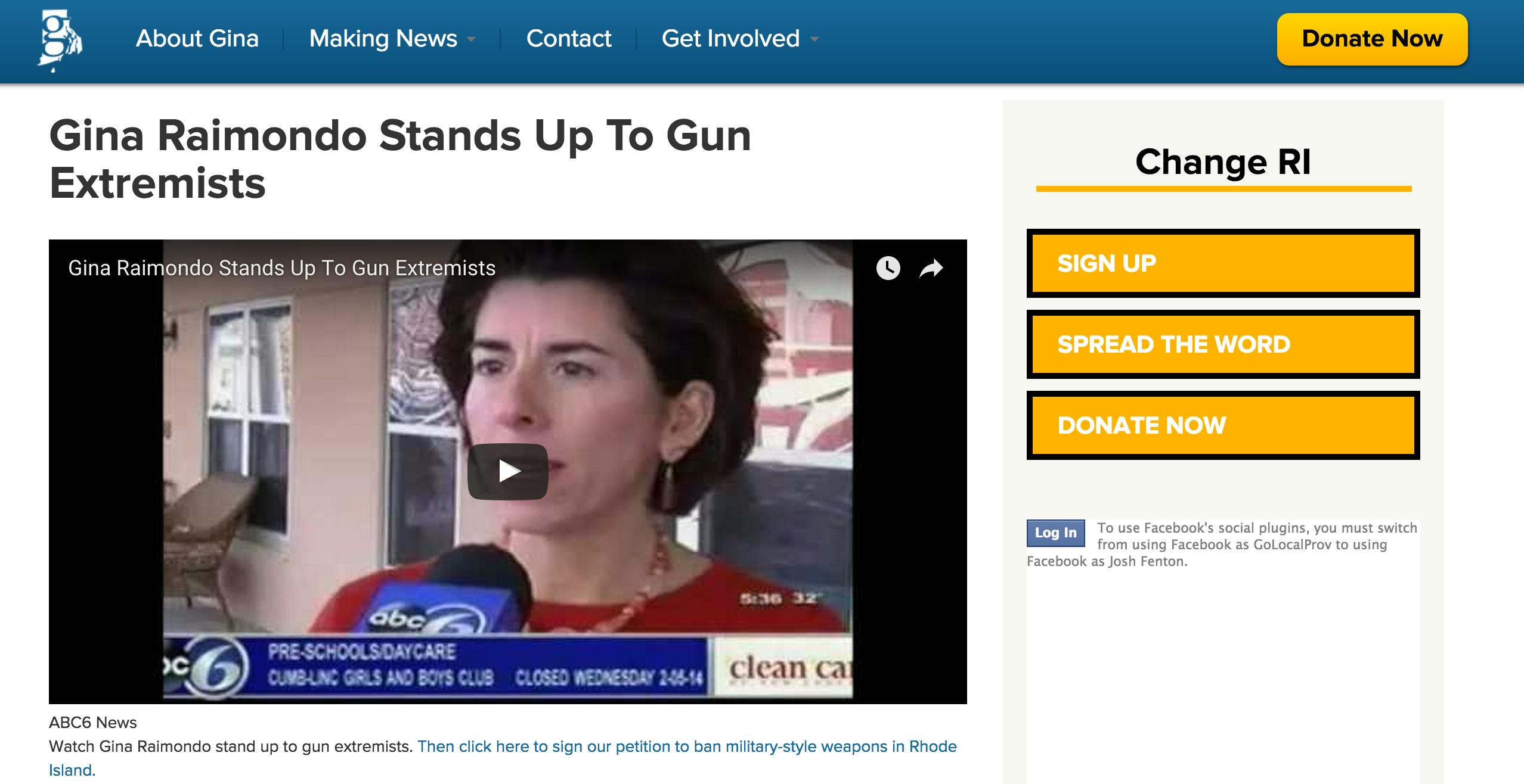 Raimondo has announced a series of initiatives to restrict gun ownership in Rhode Island. A corresponding pro-gun control campaign is being funded by Democratic heavy weight Mark Weiner and former Hasbro CEO Alan Hassenfeld.