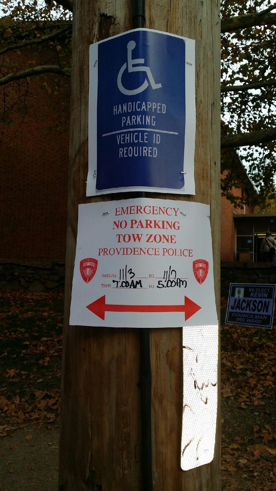 "I thought this looked like voter suppression -- voters have to park far away or down the hill on Doyle. There were signs - temporary ones -- saying no parking from 7 AM to 5 AM all week? So I took the pictures. I thought, "Are you serious? This is Mt. Hope, there are a lot of Cianci supporters here. I was at MLK all day, and it was extremely slow."