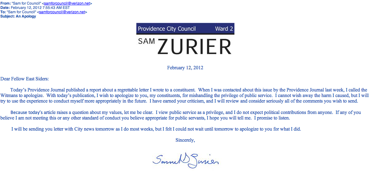 Today’s Providence Journal published a report about a regrettable letter I wrote to a constituent. When I was contacted about this issue by the Providence Journal last week, I called the Witmans to apologize. With today’s publication, I wish to apologize to you, my constituents, for mishandling the privilege of public service. I cannot wish away the harm I caused, but I will try to use the experience to conduct myself more appropriately in the future. I have earned your criticism, and I will review and consider seriously all of the comments you wish to send.