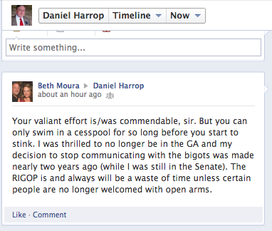 "I was thrilled to no longer be in the GA and my decision to stop communicating with the bigots was made nearly two years ago (while I was still in the Senate). The RIGOP is and always will be a waste of time unless certain people are no longer welcomed with open arms."