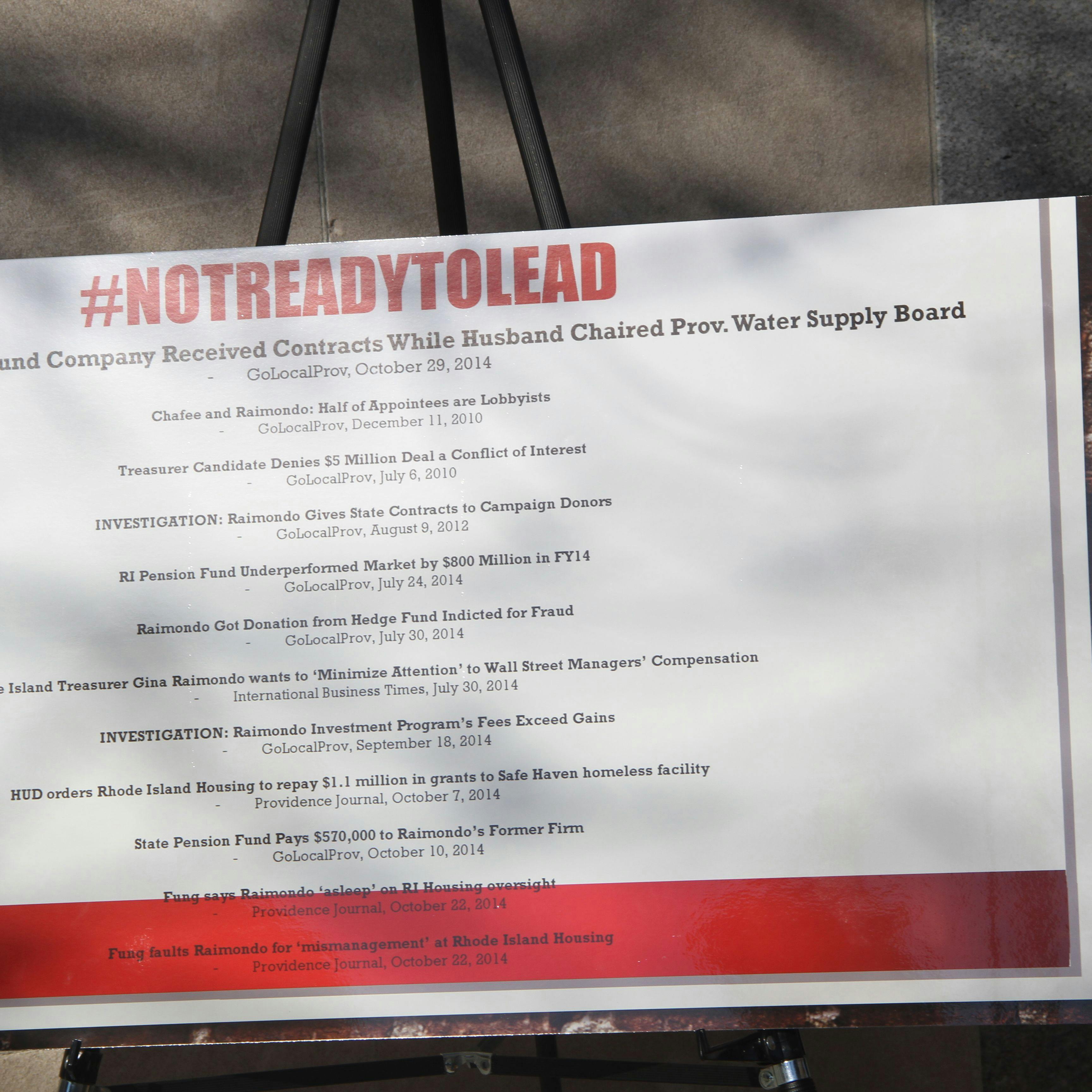 "Half of the Treasurer's and Chafee's appointees were lobbyists, the Treasurer gave state contracts to campaign donors, the State Pension fund gave $570,000 to her former firm, and her gross mismanagement and lack of oversight as a board member of RI Housing...we've seen where that's gone," said Fung.