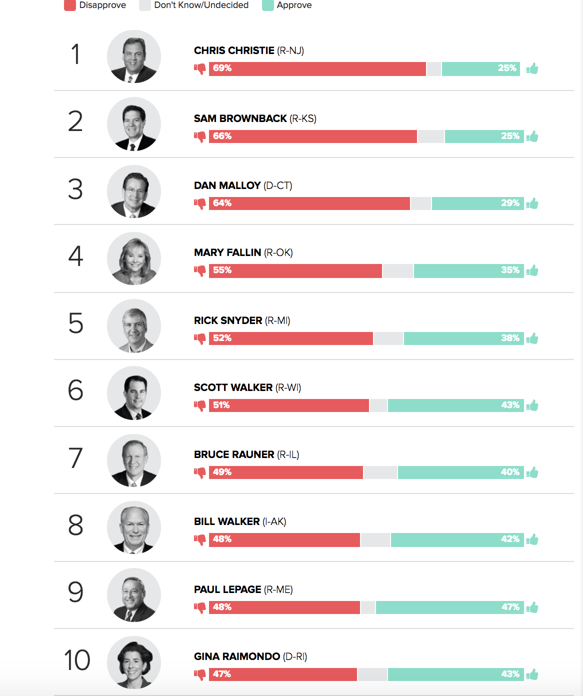 Bruce Rauner (R-Ill.) and Gina Raimondo (D-R.I.), two governors facing difficult paths to re-election next year, are also among the most unpopular governors. Almost half (47 percent) of Rhode Islanders said they disapprove of Raimondo while the share of voters approving of her job performance declined 5 points, to 43 percent.