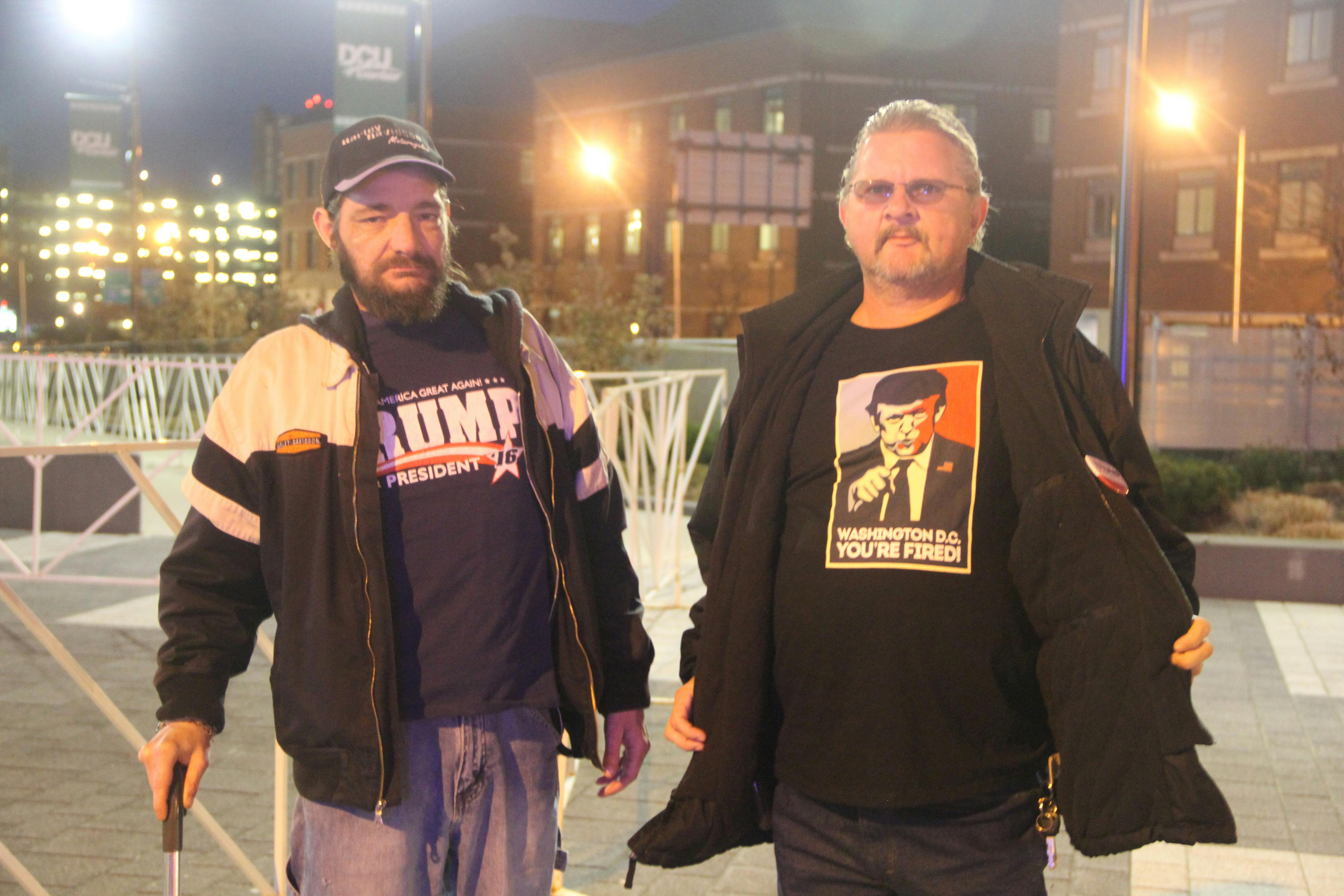 These four Trump fans wore their support proudly on their chest, and they weren't the only ones. Many fans could be seen sporting Trump hats, shirts, buttons and more as they filed into the DCU Center.