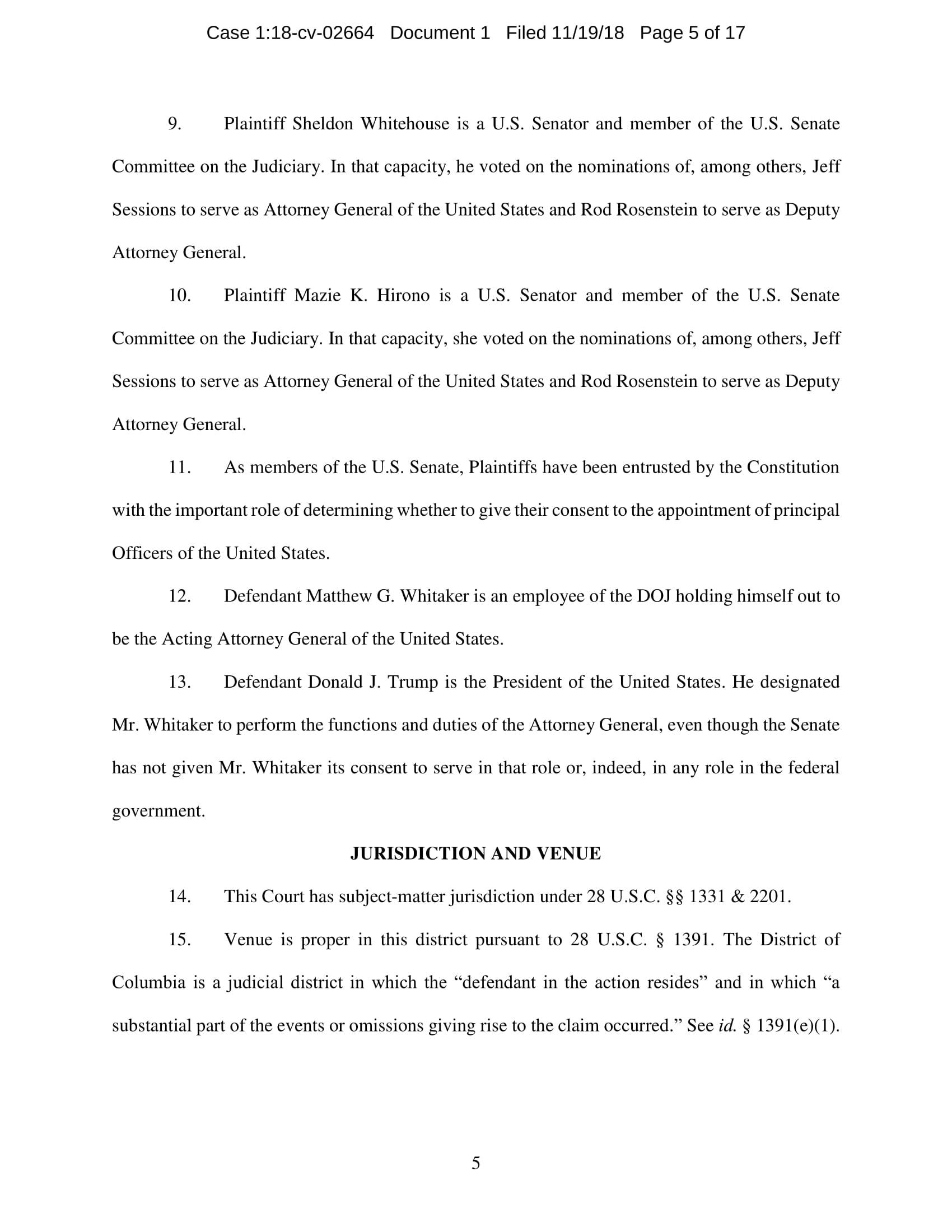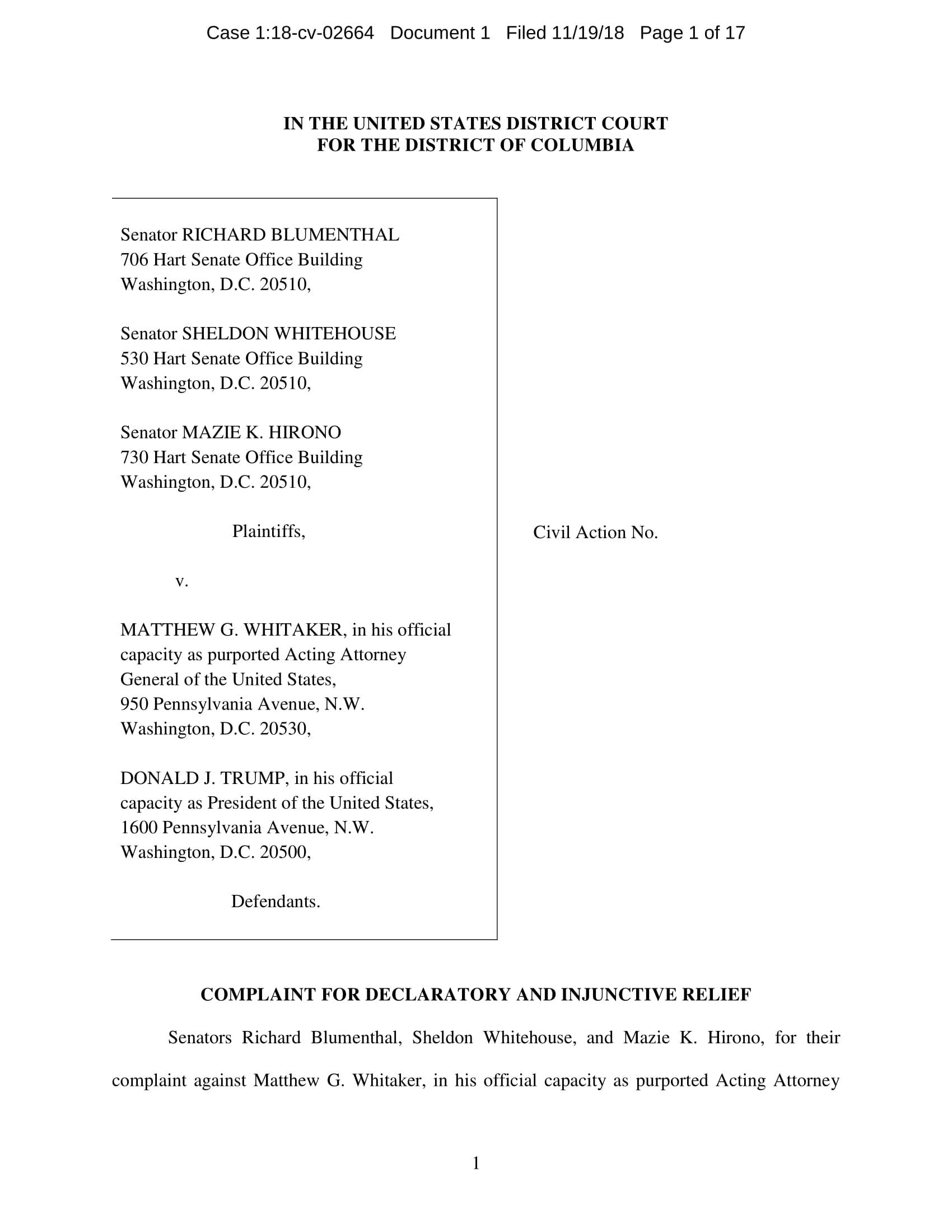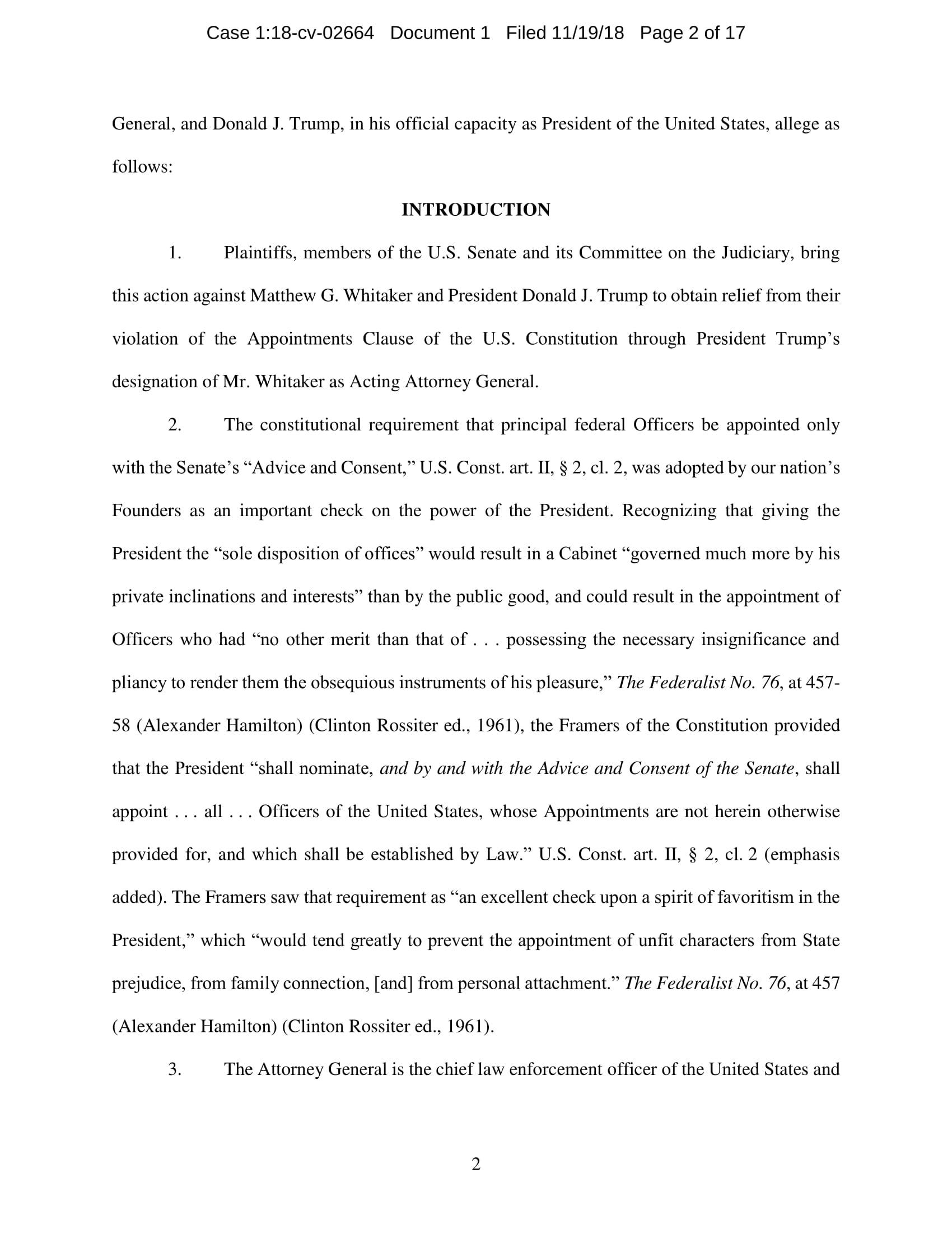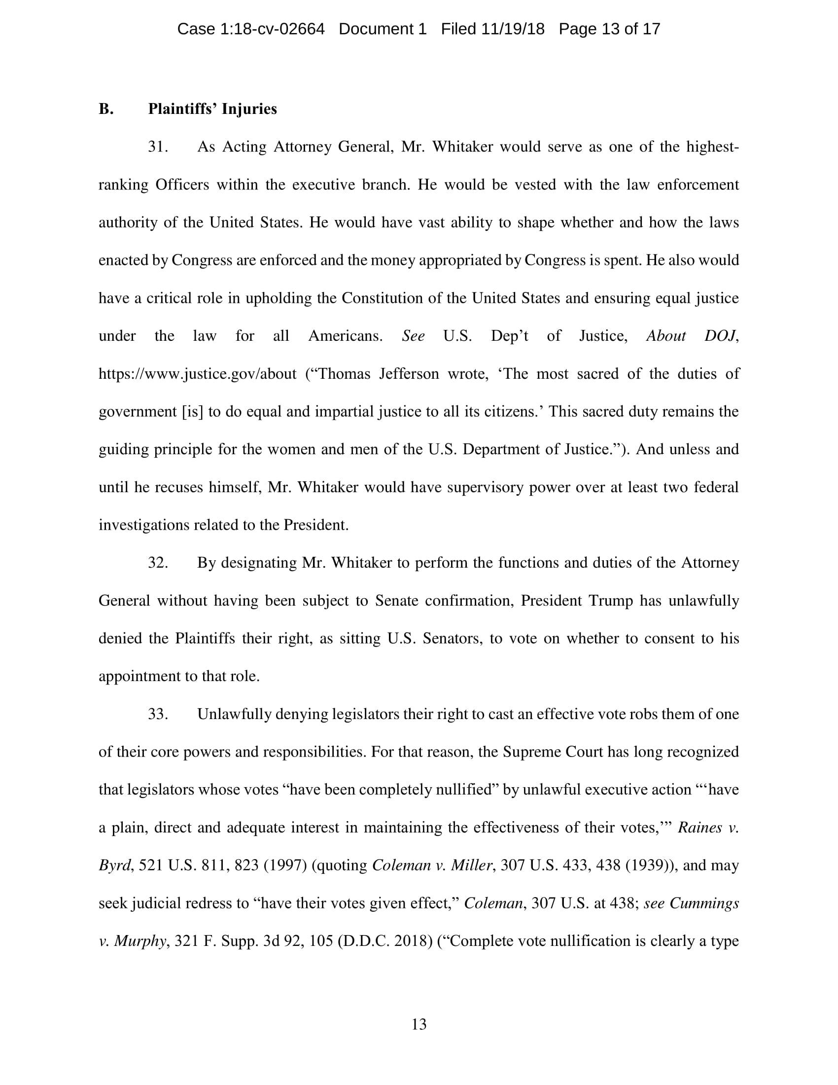 On November 7, President Trump appointed Whitaker to oversee the Department of Justice – including the Special Counsel’s investigation – in violation of the Constitution’s Appointments Clause. The Senators’ complaint asks the Court to declare Whitaker’s appointment unconstitutional and to enjoin him from serving as, or carrying out the duties of, Acting Attorney General.