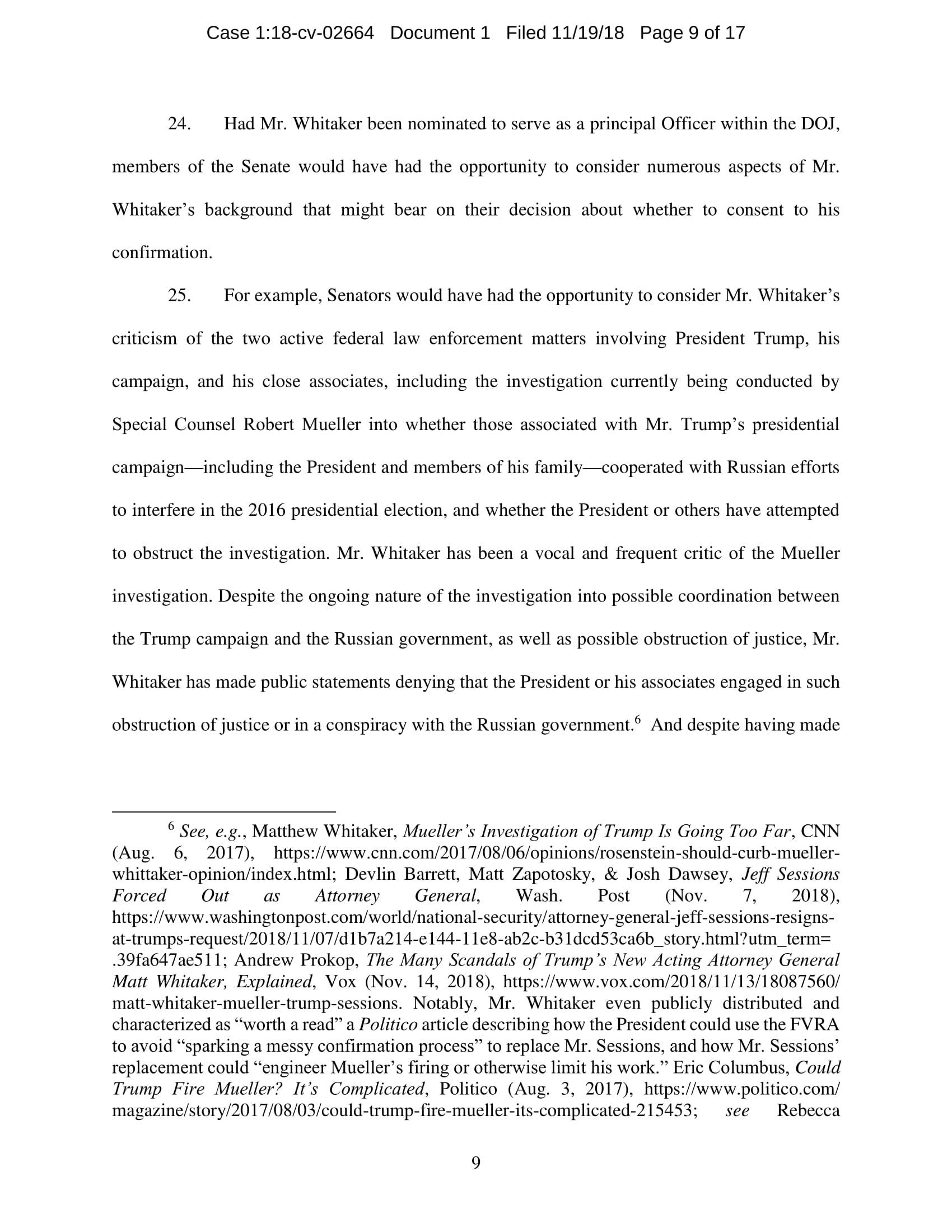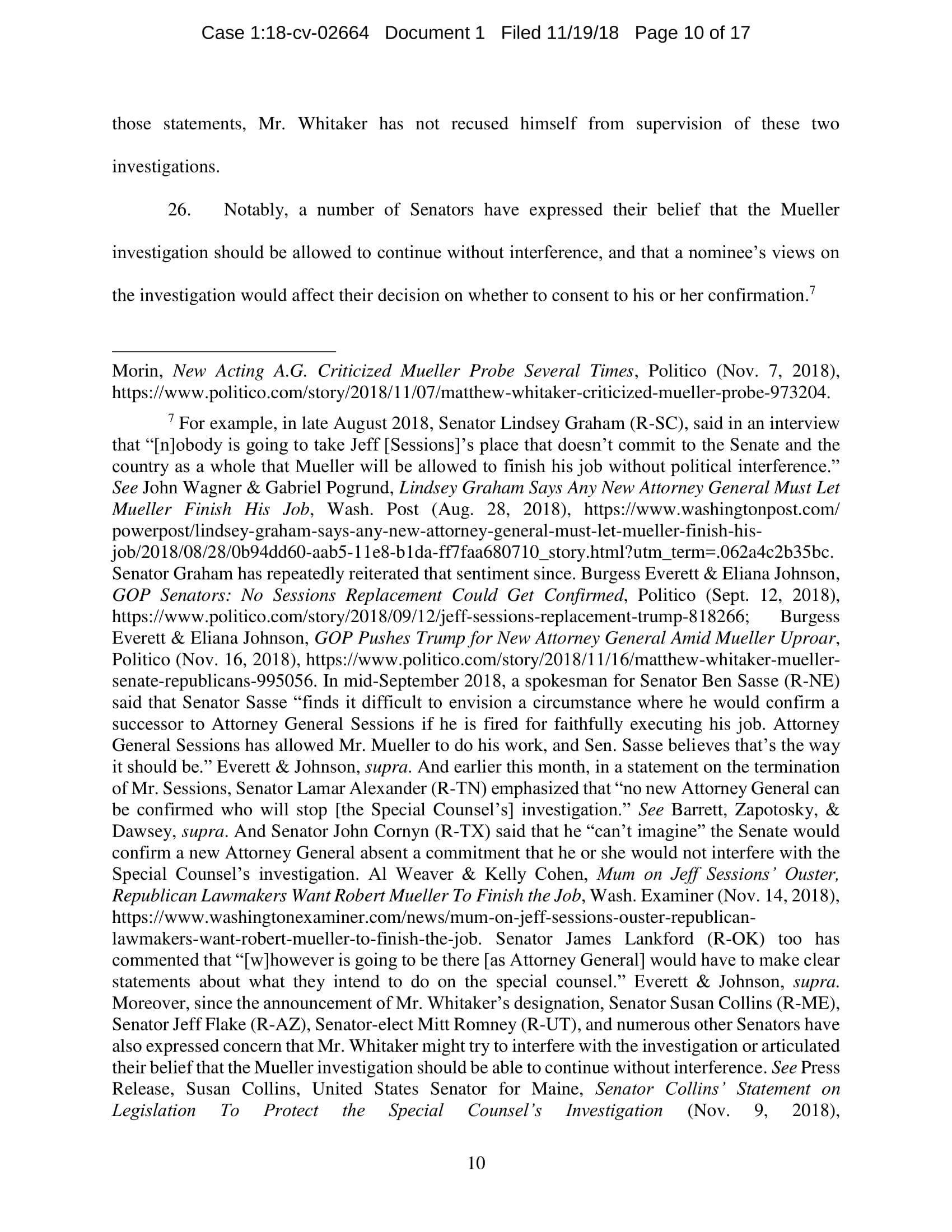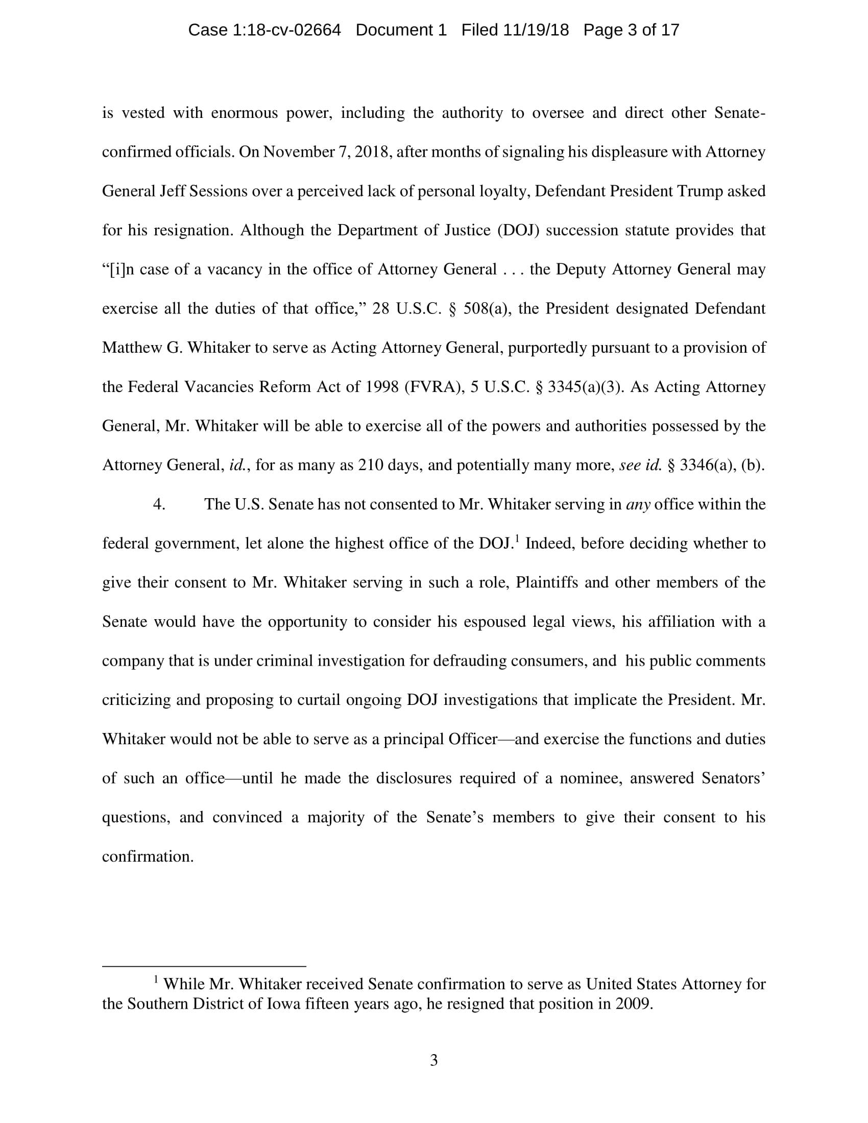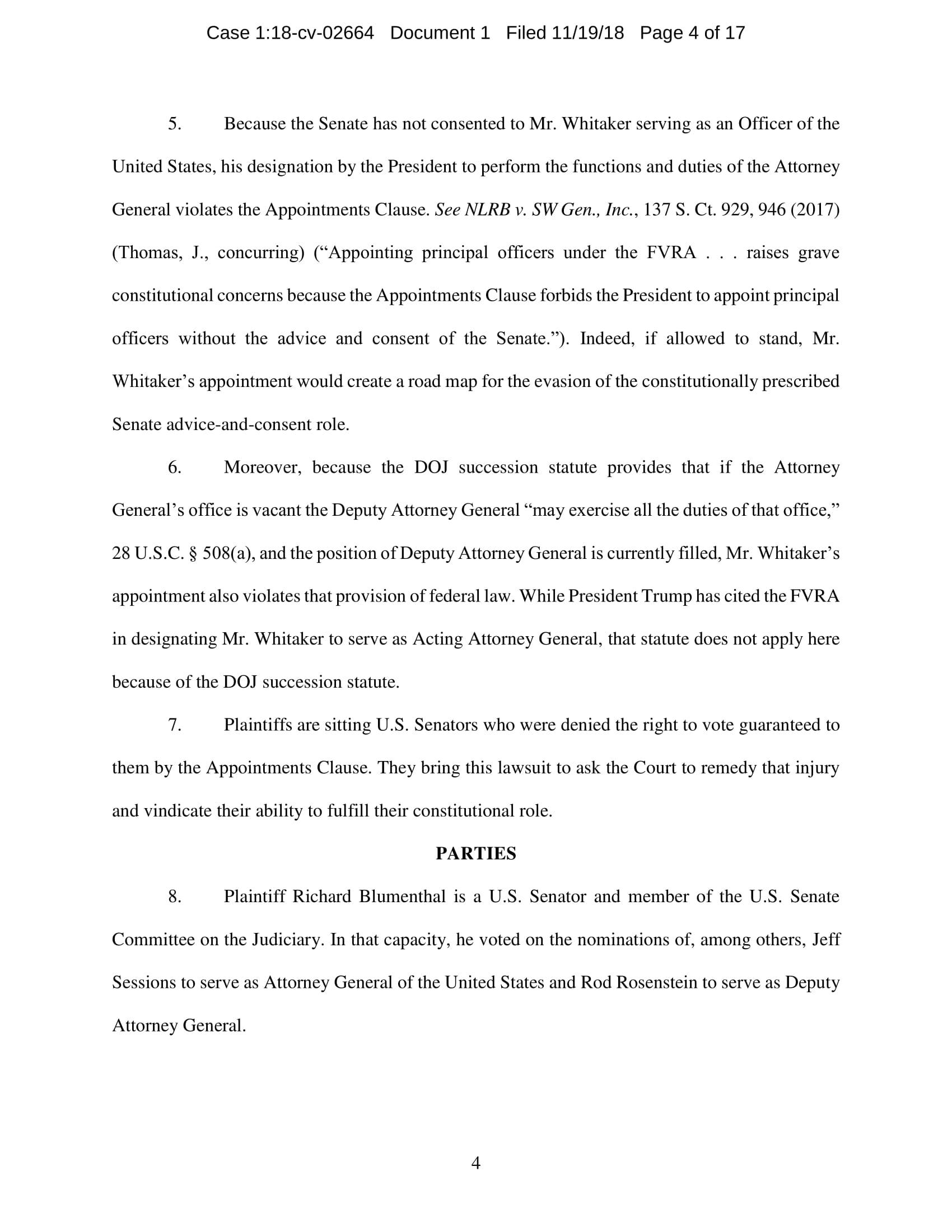 On November 7, President Trump appointed Whitaker to oversee the Department of Justice – including the Special Counsel’s investigation – in violation of the Constitution’s Appointments Clause. The Senators’ complaint asks the Court to declare Whitaker’s appointment unconstitutional and to enjoin him from serving as, or carrying out the duties of, Acting Attorney General.