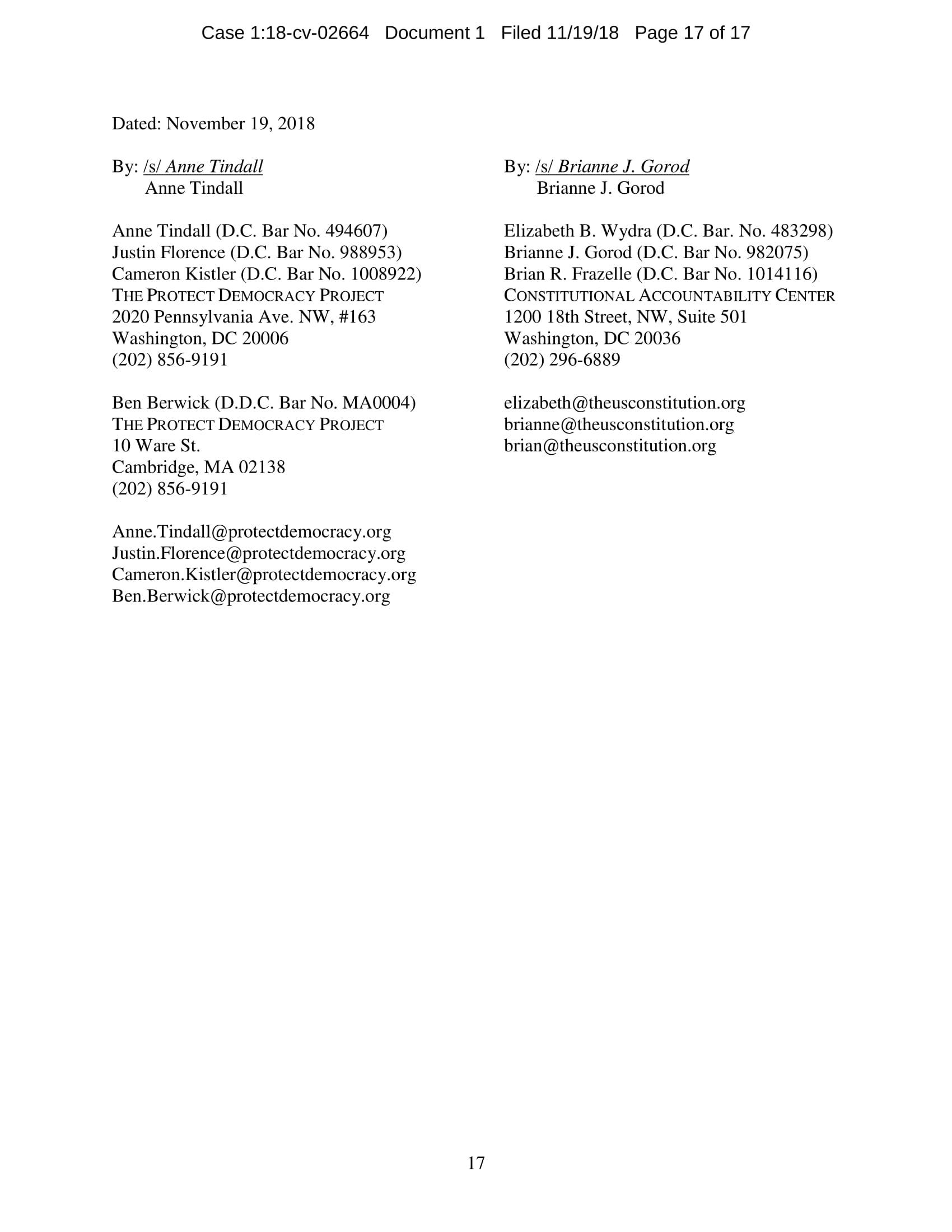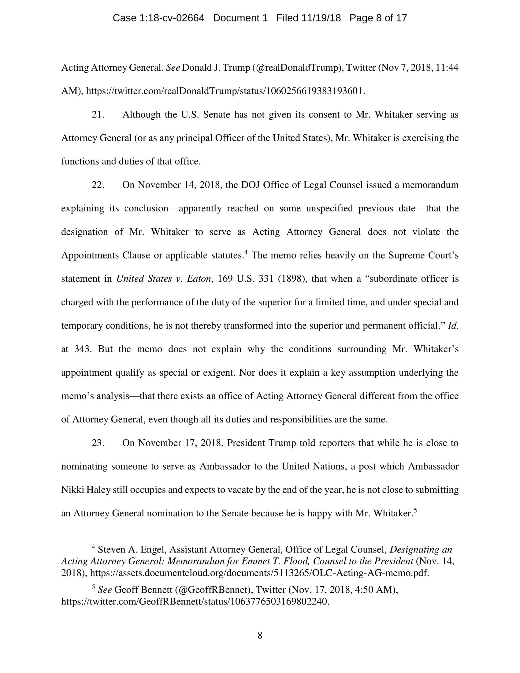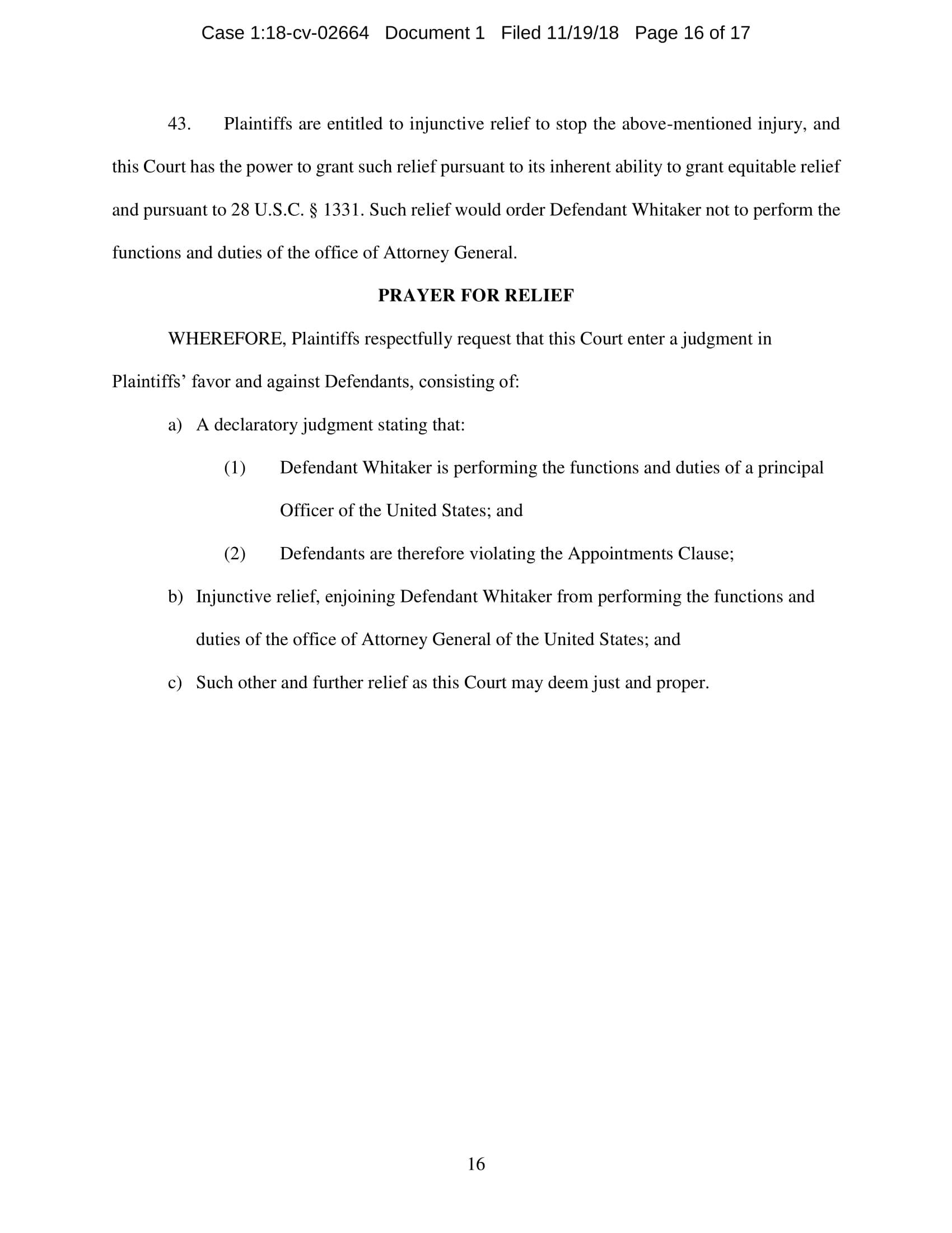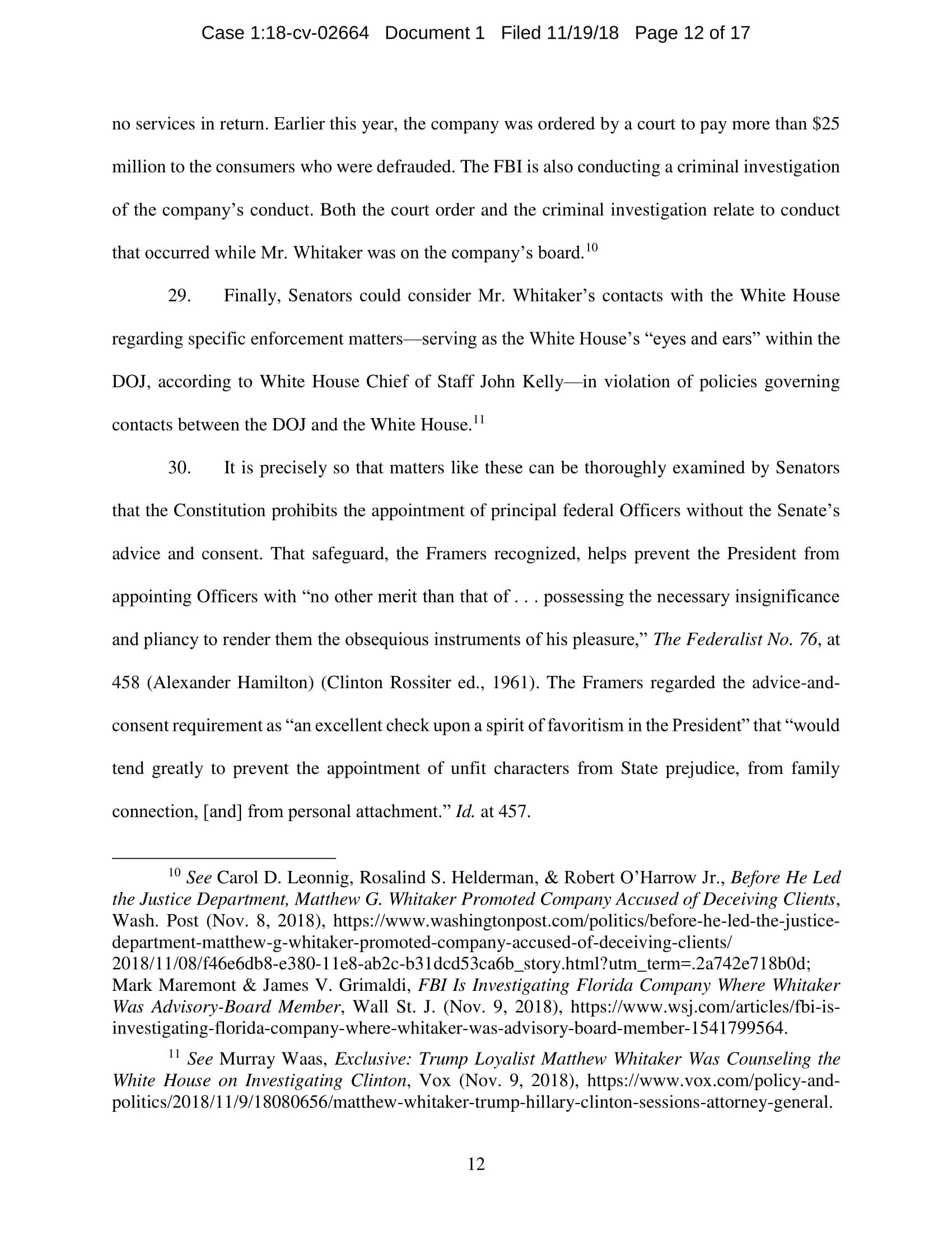 On November 7, President Trump appointed Whitaker to oversee the Department of Justice – including the Special Counsel’s investigation – in violation of the Constitution’s Appointments Clause. The Senators’ complaint asks the Court to declare Whitaker’s appointment unconstitutional and to enjoin him from serving as, or carrying out the duties of, Acting Attorney General.