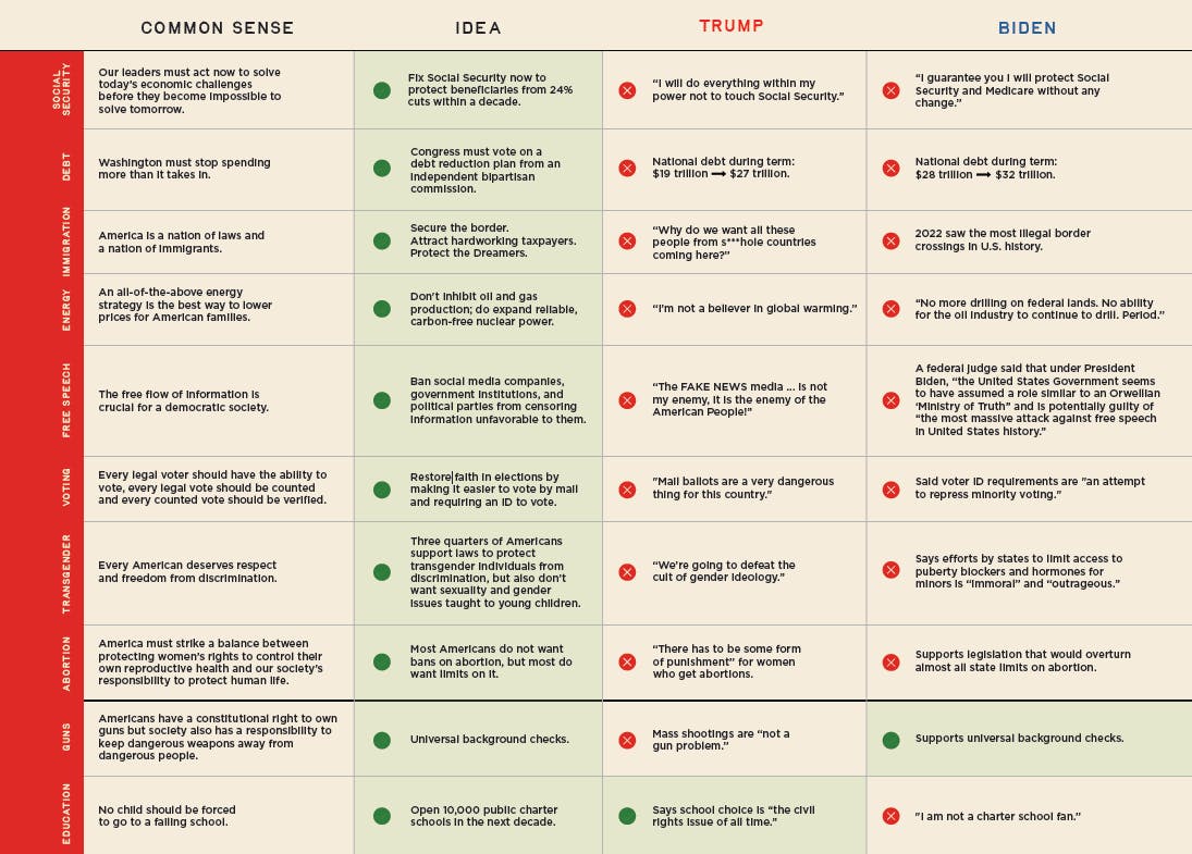 The chart below illustrates the differences between what the American common-sense majority sees as the path forward and the rhetoric of the leading contenders for their party’s presidential nomination. As No Labels Chief Strategist Ryan Clancy wrote, “We hope this chart clarifies both why America so desperately needs more voices and choices in our political process and how an independent unity ticket could develop an agenda most Americans could rally around.”