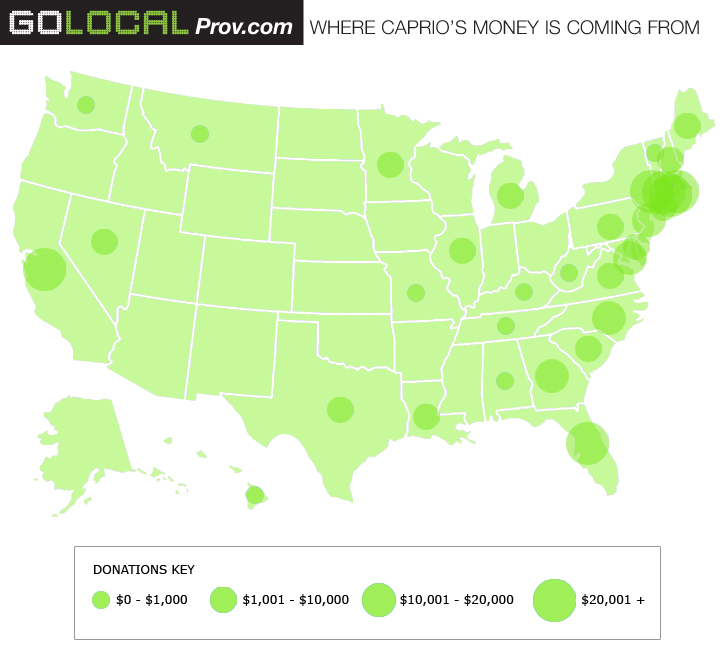 Caprio spokesman Nick Hemond dismissed the criticism. “Out of state contributions come in all the time—and Chafee has raised out of state contributions,” Hemond said. “The vast majority of contributions into the campaign have come from Rhode Islanders,” he added.