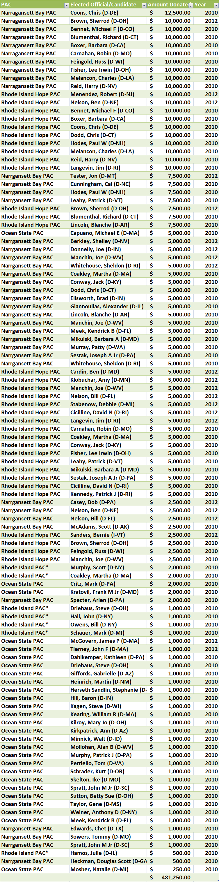 Senator Jack Reed’s Narragansett Bay PAC has been the most prolific contributor, donating $228,000 over the last two election cycles. By comparison, Senator Sheldon Whitehouse’s Rhode Island Hope PAC has contributed $212,500, Congressman James Langevin’s Ocean State PAC has contributed $32,250 and David Cicilline’s Rhode Island PAC has contributed $8,500. Cicilline’s PAC was previously controlled by Patrick Kennedy and as of June 30, contributions had yet to be made by the first-term Congressman.